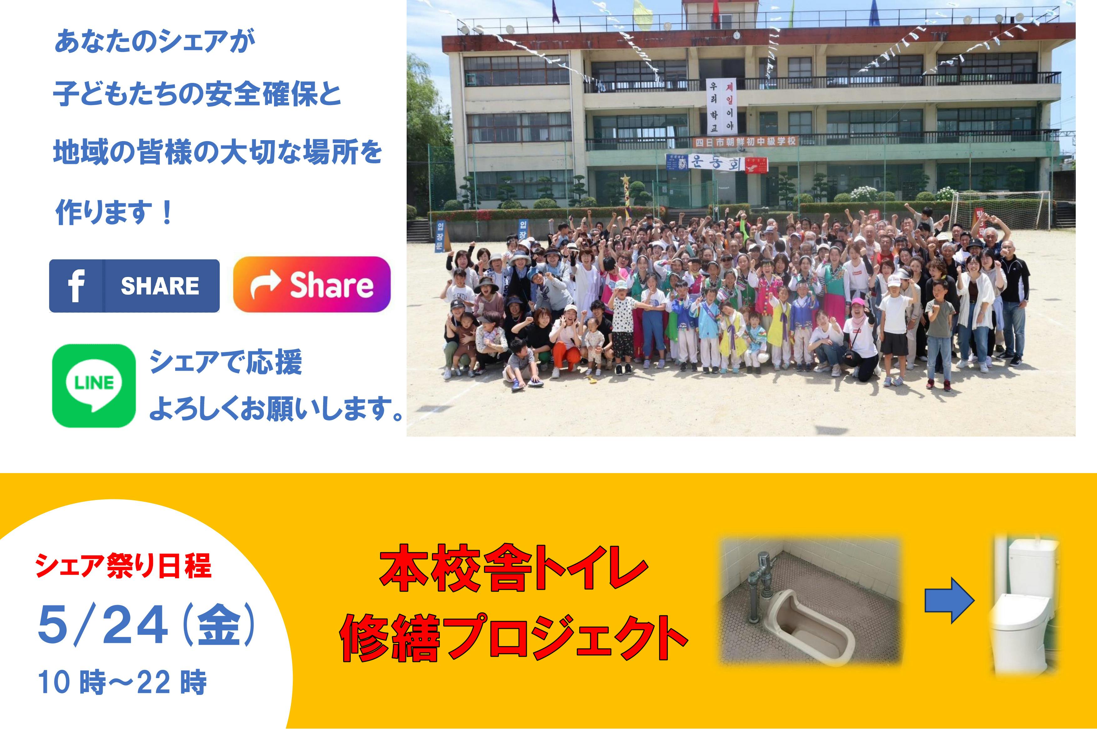 2024/05/21 09:004月2日から挑戦しているクラウドファンディングは、本当にたくさんの方々から応援をいただき、現在目標金額の70%を超えるご支援をいただいております。あたたかいご協力をいただき、本当にありがとうございます。終了は5月31日(金)24時です。それまでにできるだけ当プロジェクトの情報を広め、子どもたち、地域の方々の安全確保をすることの意義を伝えていきたいと思っています。来る5月24日(金)午前10時から、FacebookおよびInstagram、LINEにて「シェア祭り」を開催しています!「シェア祭り」とは、FacebookおよびInstagram、LINEの決められた投稿を同じタイミングで可能な限り多くの方にリツイート・シェアいただくことで、一極集中して情報拡散するSNS上のキャンペーンです。目標はFacebookおよびInstagram、LINE合わせて100シェアです!【開催日時】5月24日(金)10:00〜23:59【Facebookでの参加方法】当日中に、四日市朝鮮初中級学校Facebookの投稿をシェアしてください。四日市朝鮮初中級学校Facebookのアカウントは、こちらからご覧ください!https://www.facebook.com/yokkaichi.chousen.hakkyo【Instagramでの参加方法】当日中に、四日市朝鮮初中級学校Instagramの投稿をストーリーズでシェアしてください。https://www.instagram.com/yokkaichichojung/【LINEでの参加方法】当日中に、公式LINE四日市ハッキョサポーターズクラブの「イベント情報各種イベント」をクリックして頂き、クラウドファンディング文面を友人へシェアしてください。https://lin.ee/ZxBgPgN今回の挑戦を通して、これまで紡いできた多くのつながりや、新たに生まれた繋がりに、本当に励まされております。最後まで、頑張り抜いてまいります。ぜひ、皆さまのお力をお貸しください。新しいつながりをご一緒に広げていきましょう! もっと見る
