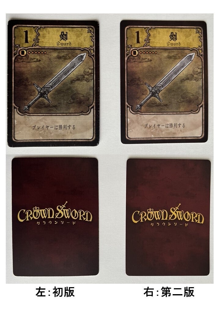 支援者様より、初版と第二版(+拡張版)のカードの比較写真を載せて欲しいと連絡がありました。連絡をいただくまで、写真で違いをお見せすることを思いつかず、初版をお持ちの皆様には不快な思いをさせてしまい申し訳ありませんでした。遅くなりましたが、写真と言葉で違いを解説させていただきます。