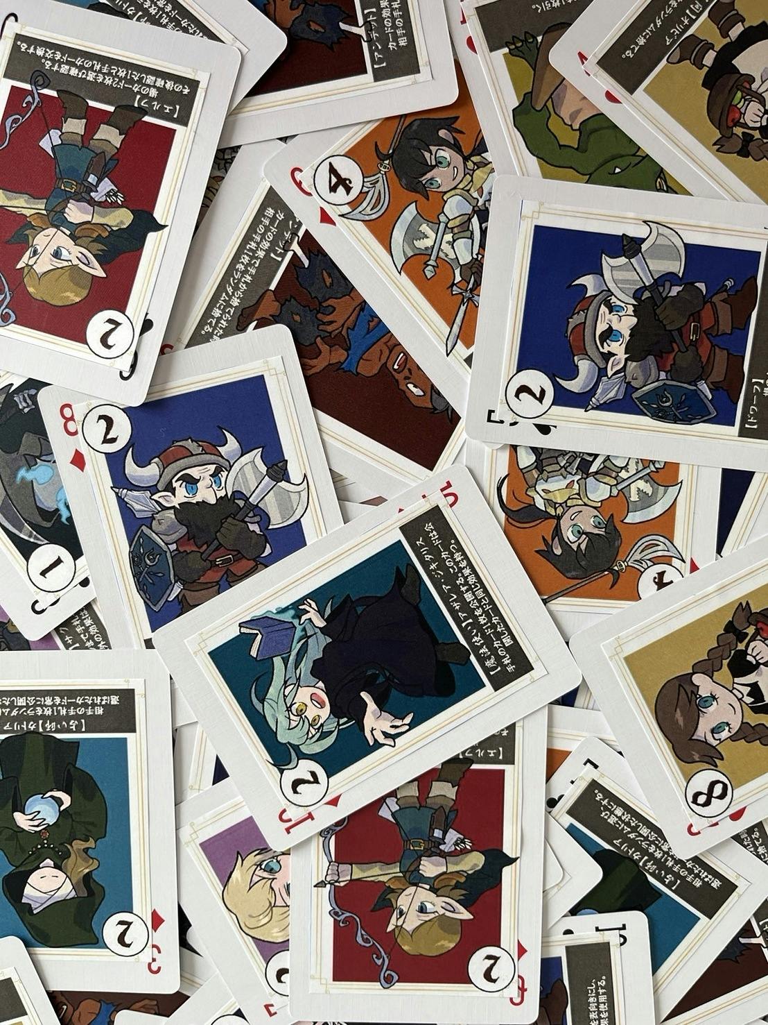 ②残りのカードをシャッフルし、各プレイヤーへ1枚ランダムに配ります。残りのカードを裏向きですべてテーブルに並べます(神経衰弱 のような感じです。これを場と呼びます)。