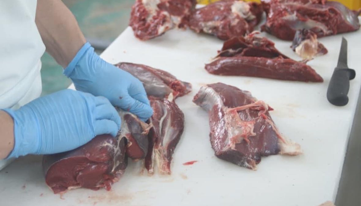 熟成したエゾシカ肉をミシュランの星付き一流レストランなどに提供し、北海道でエゾシカ肉処理施設認証施設を運営している林さんが食肉処理場の指導を行っています。