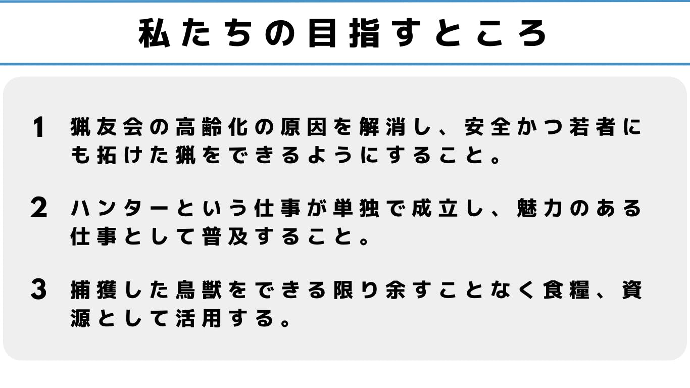 ハンターを職業として成り立たせることで、林業、農業への被害減少、社会資源の有効活用の促進、命の循環を実現します。