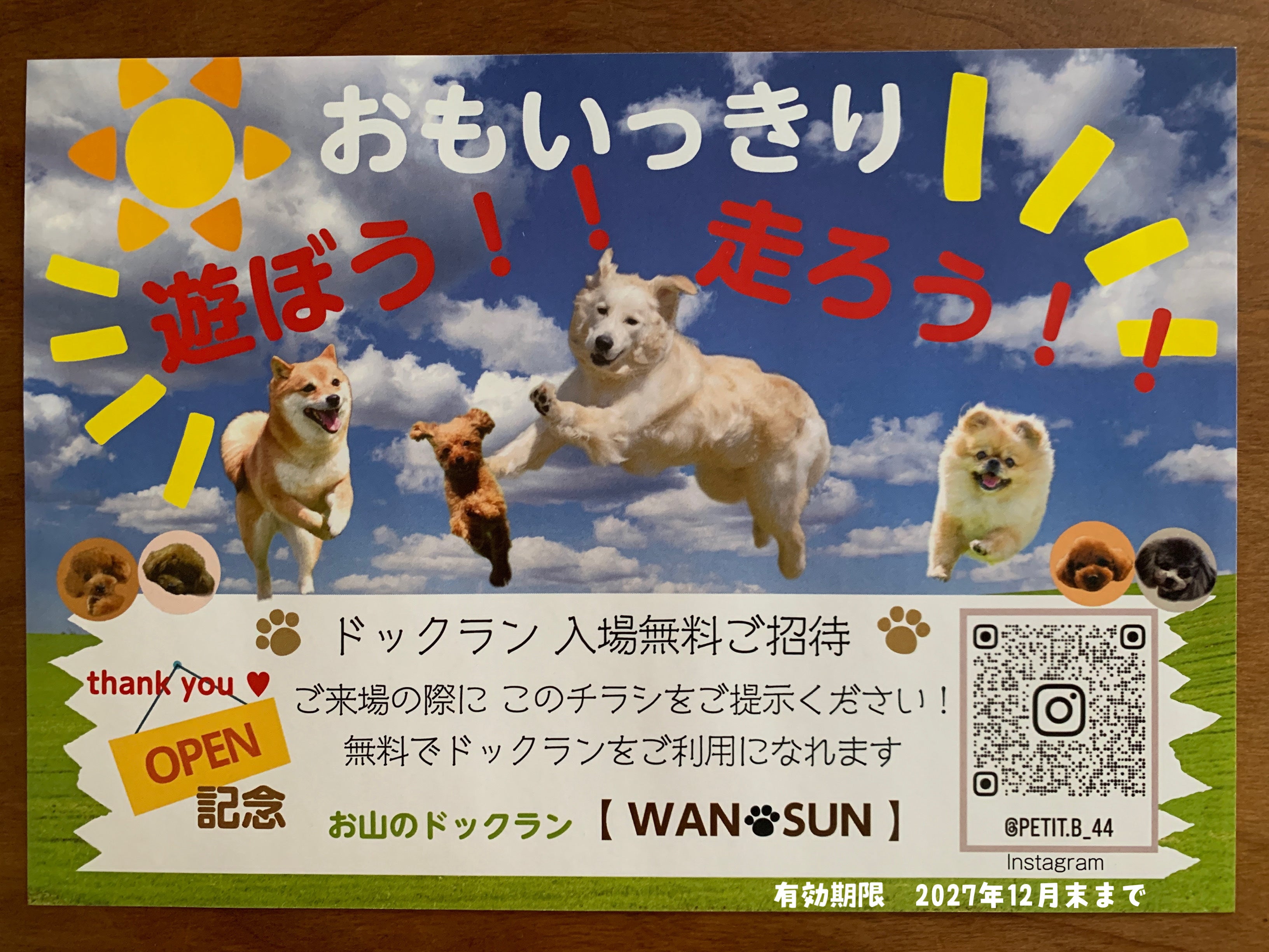 下記の【ドックランご利用 特別招待状】をご提供いたします。(有効期限は2027年12月末)
