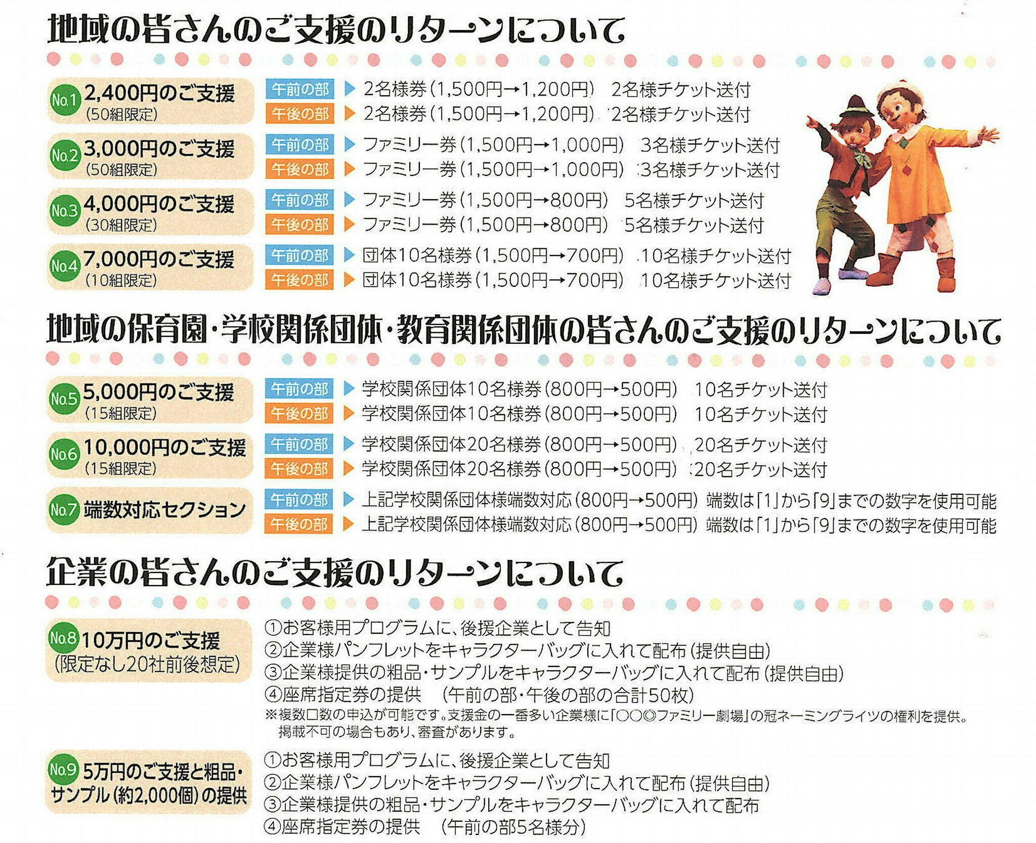 地域の皆さまには、チケットを安く買っていただくために、「ファミリー券」や「団体券」を発行しています。是非ご近所お様が集まってご来場くださいませ。保育園や学校関係の団体様には、お一人500円というお値段(支援価格)でご覧になれるようにしています。企業の皆さまへは、一社(一口)10万円のご支援金をお願いしています。ご近所のスーパーさんやパン屋さん病院のお医者さんにも応援していただきたいと思っての、支援金価格です。