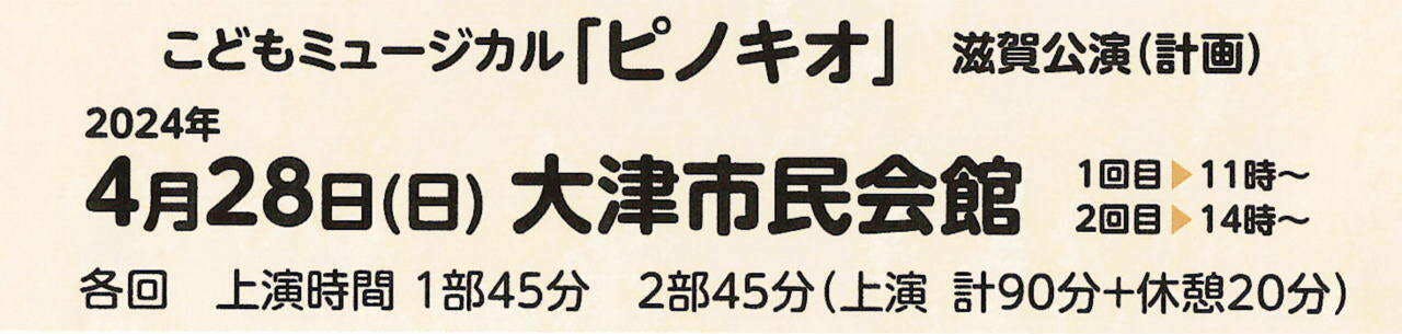 汽車ポッポでお馴染みの劇団銀河鉄道は、「小さな胸に大きな感動を」テーマに子供ミュージカル「ピノキオ」を全国60か所で縦断公演をします。全国巡回開始の第1弾は京都から、4月27日(土曜日)、宇治市文化センターが初演です。第2弾が、滋賀県、4月28日(日曜日)、大津市民会館です。