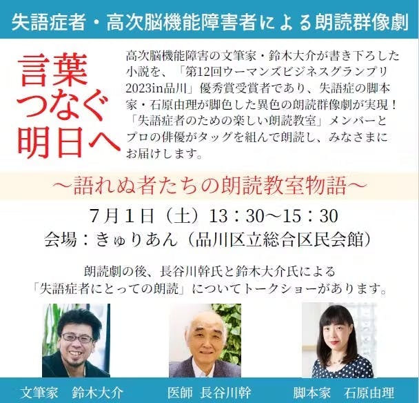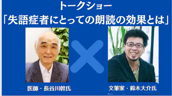 朗読劇の後には、医師 長谷川幹氏と文筆家 鈴木大介氏の「失語症者にとって朗読の効果とは」についてのトークショーがあります。