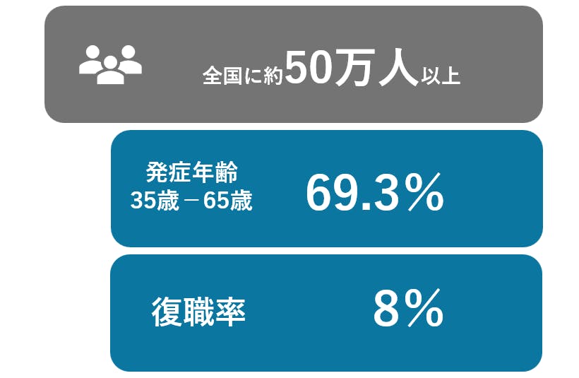 全国に約50万人以上いるとされていますが、社会的認知、保健、医療、福祉などのあらゆる分野で対策が遅れている疾患であるため、具体的な患者の人数は明らかになっていないのが現状です。