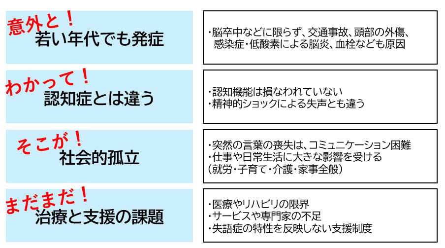 失語症は、見た目では分からない「見えない障害」として、多くの社会課題を引き起こしています。