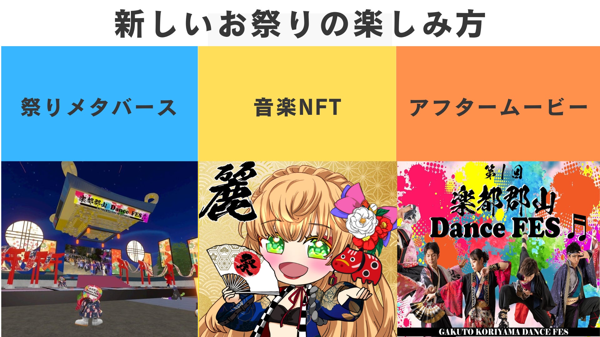 2023年には、イベントのテーマソングをNFTとして販売し、伝統と革新の融合から新しい文化体験を創出しました。この取り組みは全国的に注目され、「まちづくりハーモニー賞」を受賞し、「みんなで!福島2022-23創刊」に掲載されるなど、その成果が広く認められました。さらに、メタバースの導入により、テクノロジーを活用した文化発信を進め、郡山市から新たな文化の息吹を全国、そして世界へと広げています。