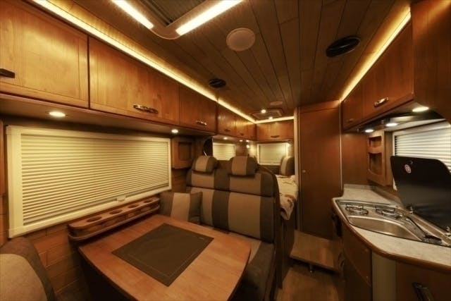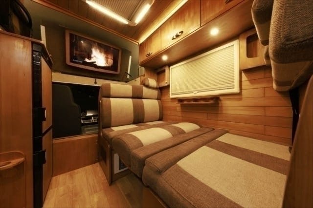 トイレ、シャワー、キッチン、テレビ、リビングなどが一通り揃っているキャンピングカーの利点ですね。(乗車定員:7人)