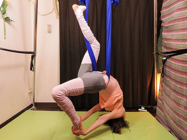 エアリアルヨガのマンツーマンレッスンは折り畳み式スタンドを持ち運ぶことで屋外、または公共の運動施設内で実施予定です。