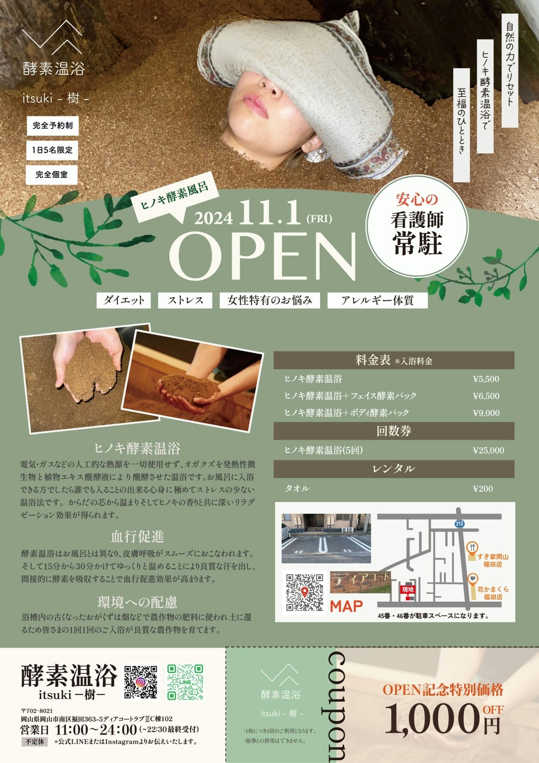 2024/10/16 08:20大切なお知らせ是非最後までお読み下さい。今年の年明け頃から準備を続けてきた酵素温浴itsuki-樹-ようやく皆様にお披露目ができそうです。わからない事だらけの中本当にたくさんの方に助けて頂き、なんとかここまで来ることができました。ありがとうございます。皆様から色々ご意見を頂き取り入れながら店舗を作り上げています。皆様に自信を持って、完成した酵素温浴を提供させていただきますが、まだまだ手探りな部分が多くございます。そのため、グランドオープン前にプレオープン期間を5日間設けさせて頂くことといたしました。プレオープン:10月19日.20日.21日.26日.30日グランドオープン:11月1日時間:11:00〜22:30(1日にご入浴可能な人数が限られておりますので、その際は早めに閉店をさせて頂きます。)プレオープン期間中はスタッフの調整期間であり、色々とご不便をおかけする場合がございます。多少の不手際があるかもしれませんが、ご理解、ご協力の程よろしくお願いいたします。ご予約はお電話、またはLINEからお気軽にご連絡下さい。(お電話に出られないことがございます。LINEよりメッセージを頂けると大変助かります)では、皆様とお会いできる日を楽しみにしております!!!!!! もっと見る