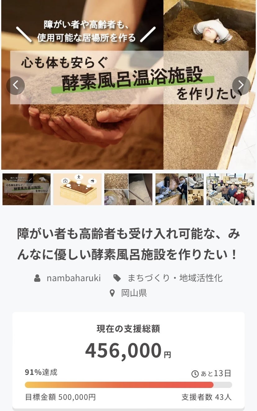 みなさんこんばんは♪いつも応援メッセージや拡散、支援頂きありがとうございます!皆様の温かいご支援により現在84%を達成しております!!!ここまで来たら、目指すは100%ゴールは着実に見えてきております。お忙しいところ恐縮ですが、今一度拡散をしていただければ幸いです!そして支援も大変嬉しく、応援メッセージもお一人おひとり読ませて頂いております。残り25日となっておりますが私もなるべく早く皆さんを酵素浴施設にご案内できるように精進いたしますので、ご協力の程何卒宜しくお願いいたします!!