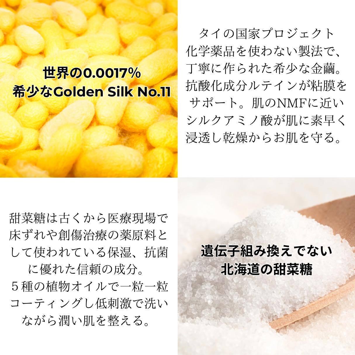 タイの国家プロジェクトで丁寧に作られる希少な金繭と医療の現場でも床ずれ治療薬の原料となる北海道の甜菜糖がベース。
