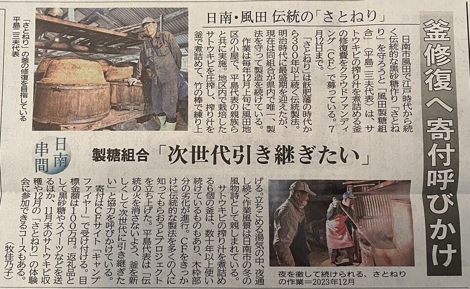 風田製糖組合の平島です。おかげさまで本日目標金額の50%まで到達しました。