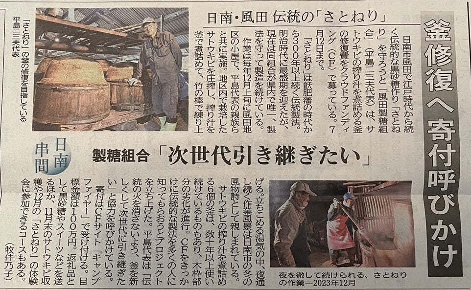 風田製糖組合の平島です。おかげさまで本日目標金額の50%まで到達しました。残り日数も少なくなってきましたが、さとねり継続に向けて諦めず目標達成に向けて頑張りたいと思います。ご覧になられている皆様には、引き続きプロジェクトの周知いただけますと幸いです。6月23日に地元新聞紙の宮崎日日新聞に掲載されました。日南だけでなく、宮崎県全体の皆様に伝統文化「さとねり」を知っていただく良い機会となりました。宮崎日日新聞さま、取材・掲載いただきありがとうございました。