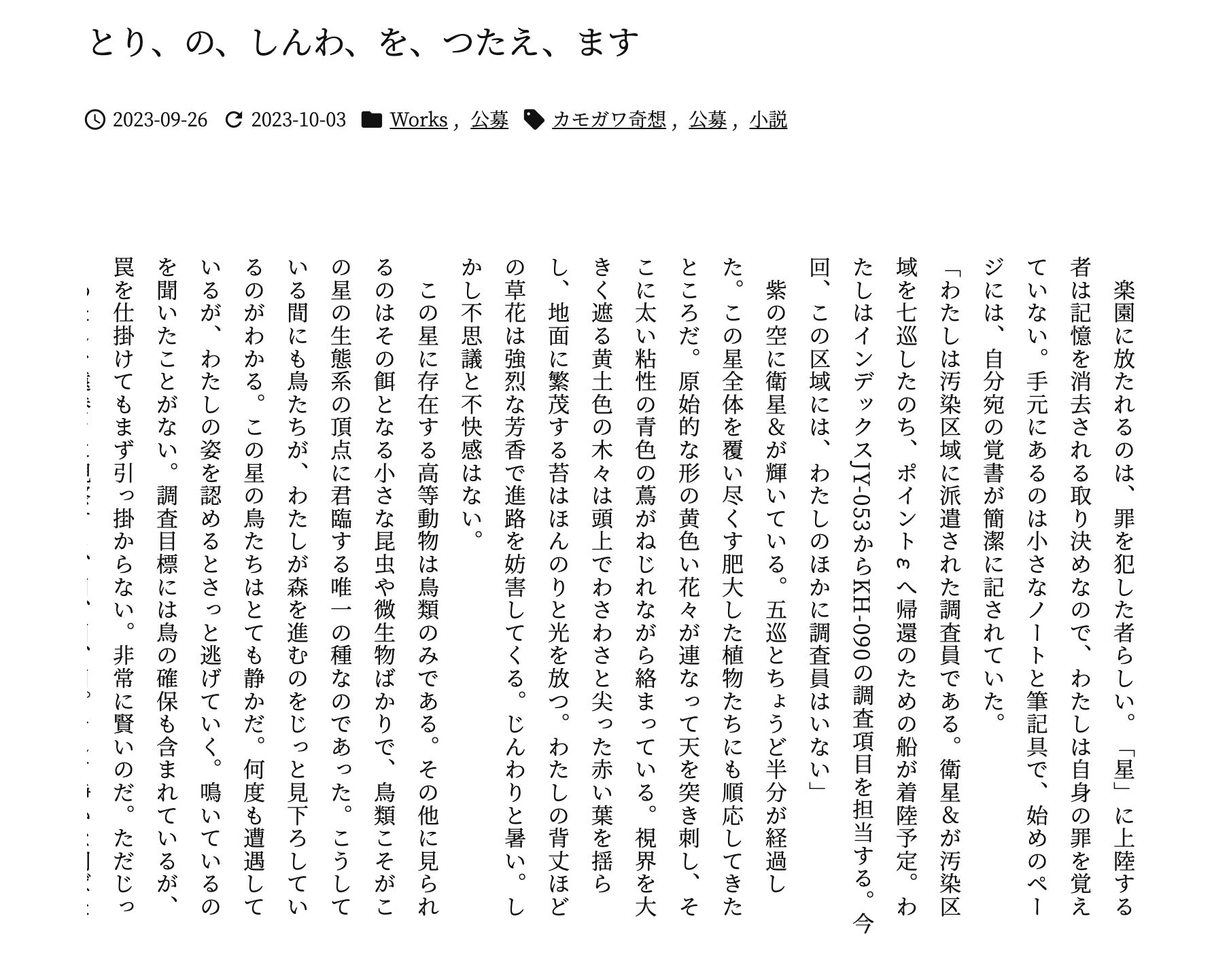 ふだんは主に、鳥と奇想を書いています。先ほど挙げた作品すべてに鳥が登場することにお気づきでしょうか。コミッションでは、鳥以外も書きますのでよろしくお願いします。奇想と書きましたが、現実なんだけど現実じゃないような、此界と異界のはざまにいる錯覚に陥るような感触を書けたらいいなと思っています。故郷喪失アンソロジーでは赤裸々に自身のことを書きましたが、ふだんの作風はこんな感じです。