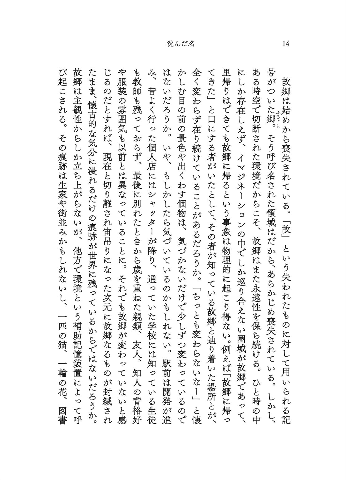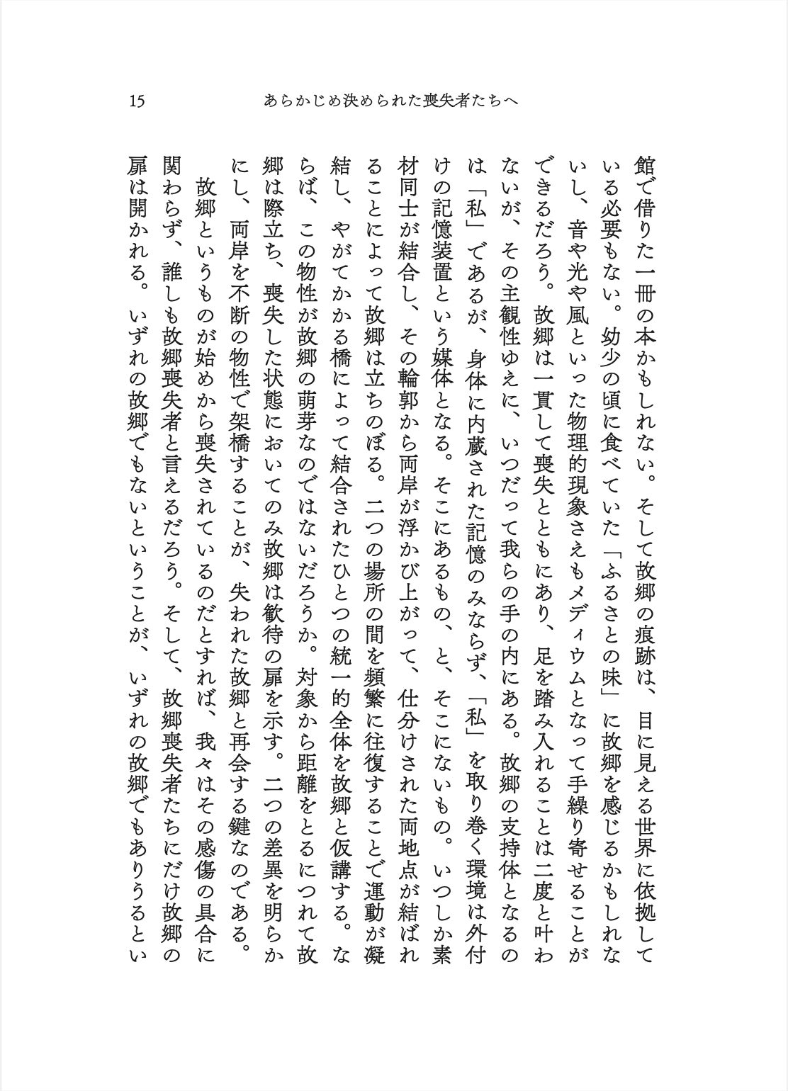 故郷は始めから喪失されている。「故」という失われたものに対して用いられる記号がついた郷(ふるさと)。そう呼び名された領域はだから、あらかじめ喪失されている。