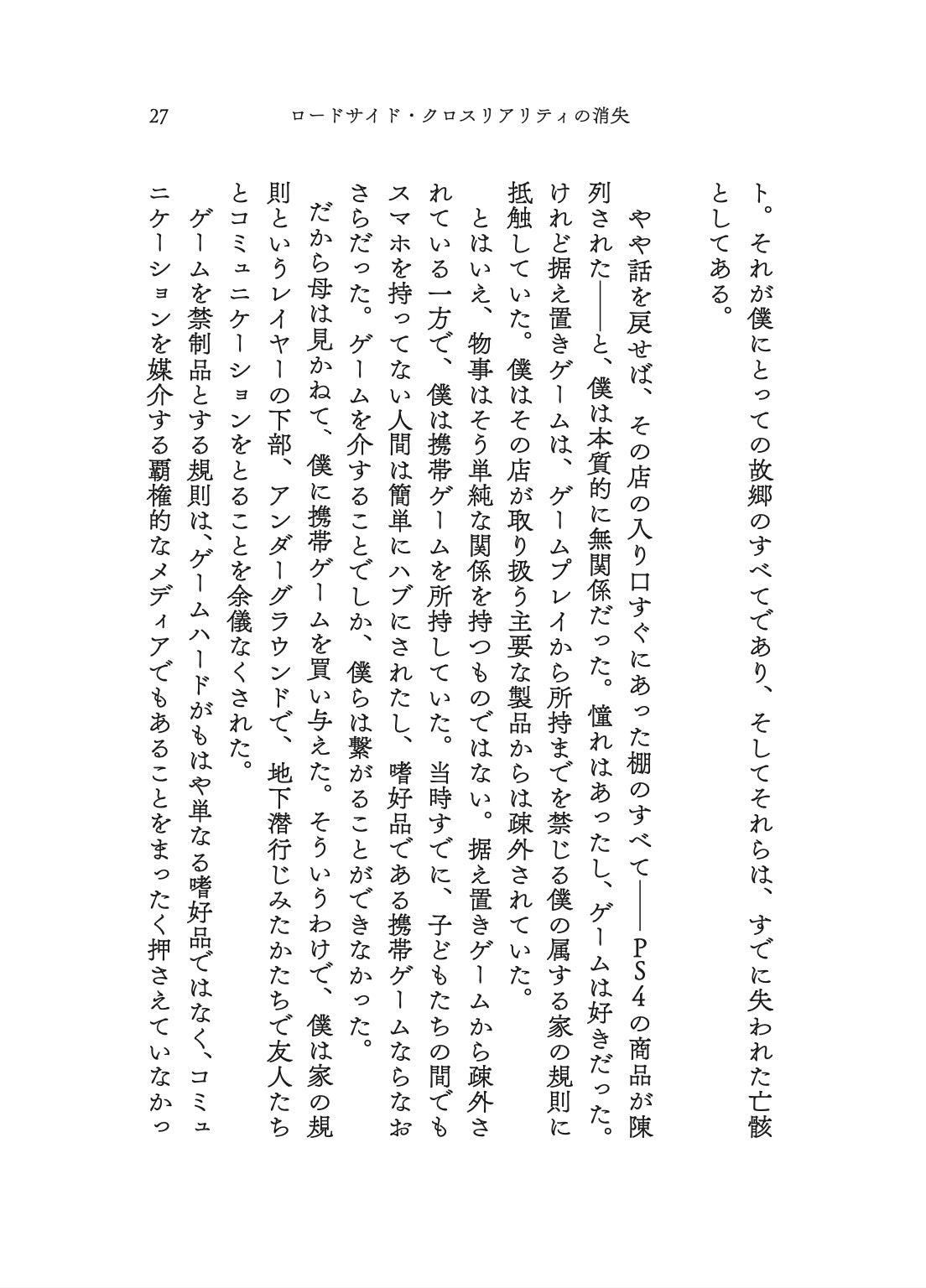 城輪アズサさんは創作・批評を中心に活動されています。県道沿いにあったゲームの専門店についての回想と、城輪さんにとってのもう一つの故郷、「ミーバース」についての思い出が交差します。どちらも「平成」の印象が強いエピソードであり、すでに失われた時代、故郷としての平成が浮き彫りにされるエッセイに仕上がっています。故郷喪失というと失われた場所を思い浮かべがちですが、区切られたある時間、すでに過ぎ去ってしまった時代も故郷となりうることがわかります。