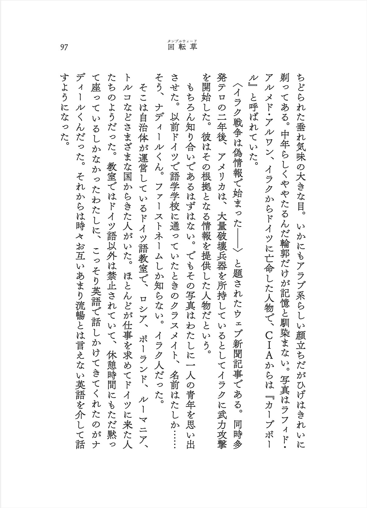 万庭苔子さんはエッセイや翻訳、小説を手がけられています。物語はドイツに住んでいたことのある「わたし」がドイツ語学校で知りあったイラク人、ナディールくんとの思い出話が中心となり、やがて人称を超えて世界の人々が混ざり合っていく祈りの地点へ着地します。今読まれるべき小説です。