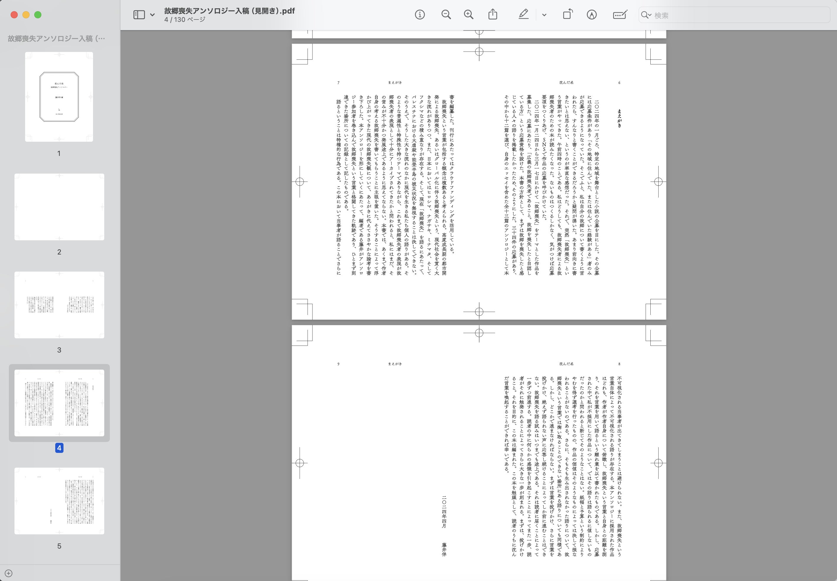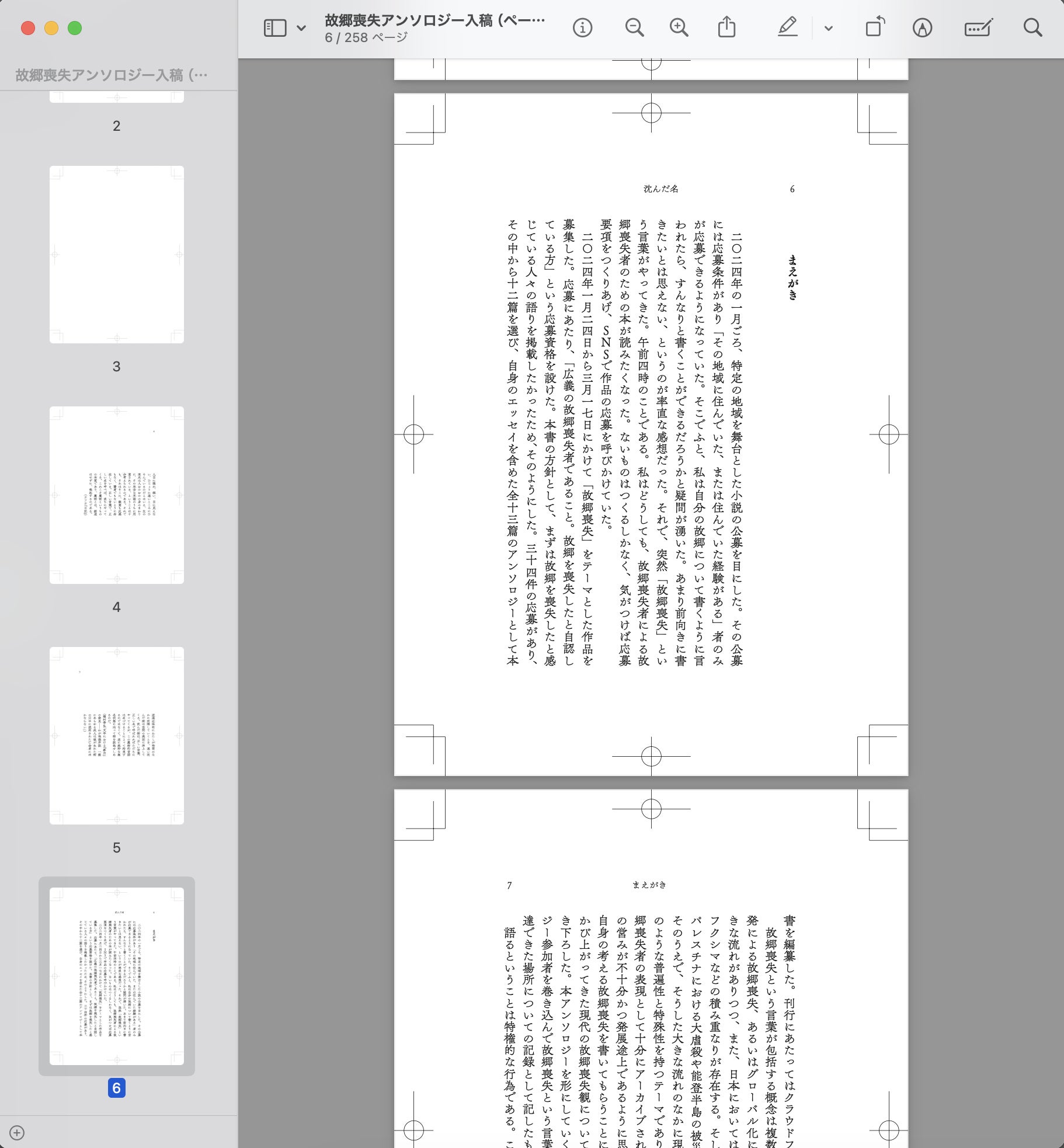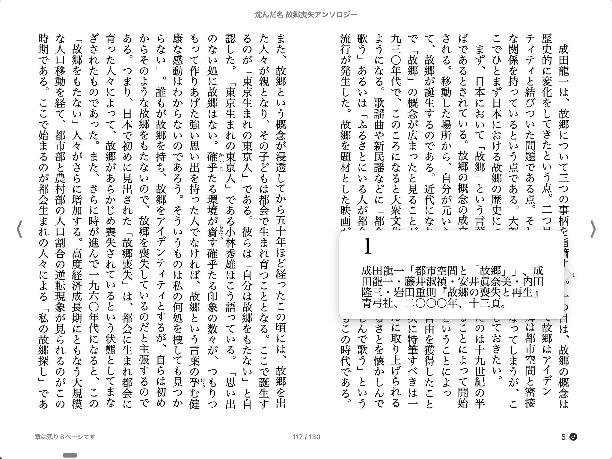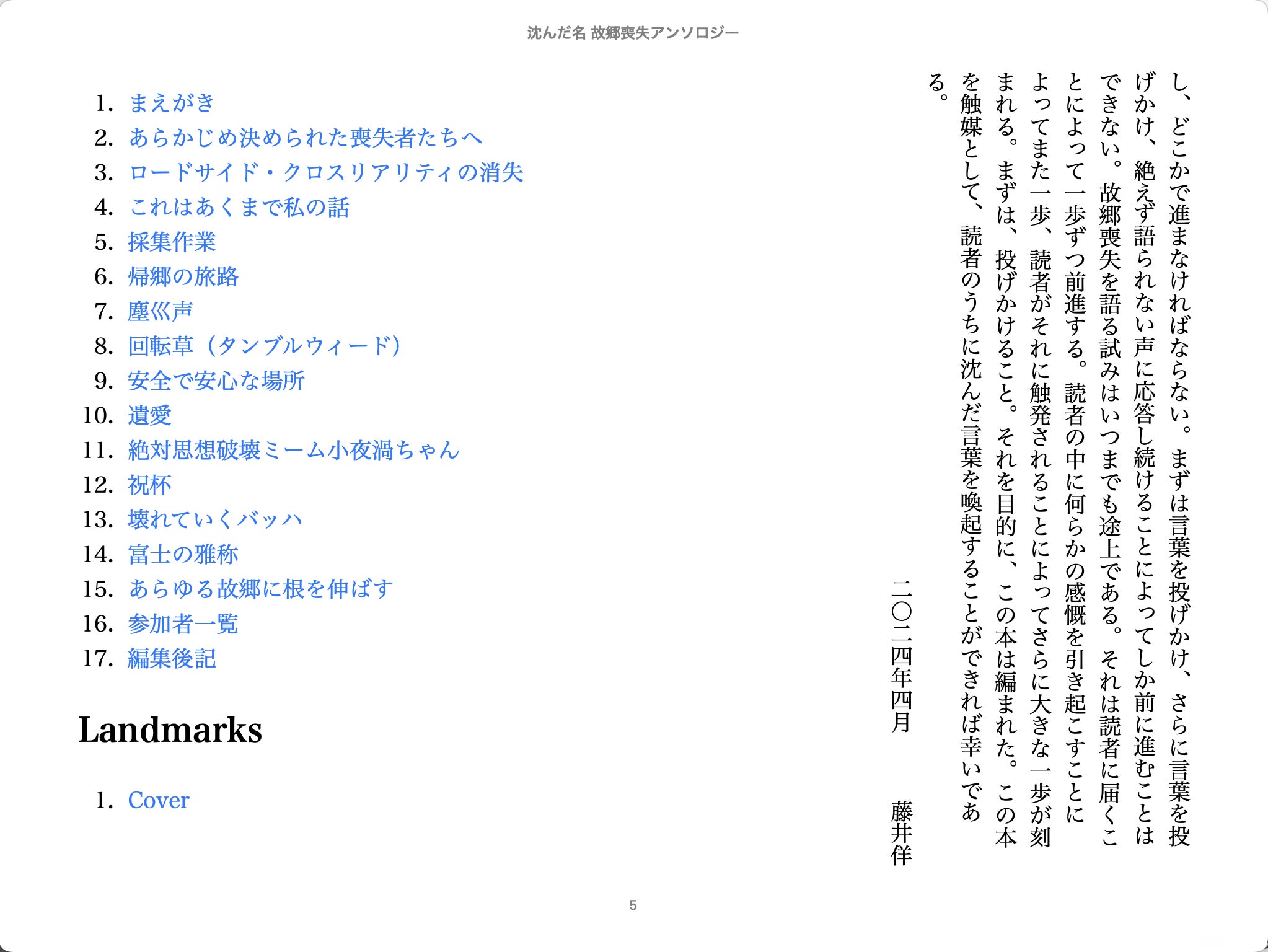 ↑の画像は、Macに標準搭載されている「ブック」でEPUB形式の「故郷喪失アンソロジー」を表示してみたところです。2、3枚目のように、目次にリンクを貼ることや、脚注をポップアップ表記にすることなどもできます。