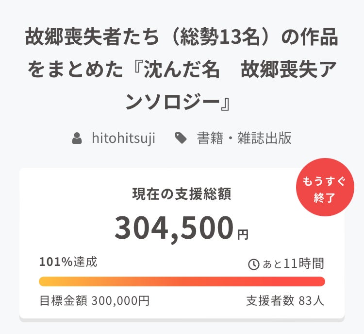 CAMPFIREの「雑誌・書籍出版のクラウドファンディング」の一覧ページに「人気」のプロジェクトとして「故郷喪失アンソロジー」が掲載されていました。嬉しいですね。ありがとうございます。
