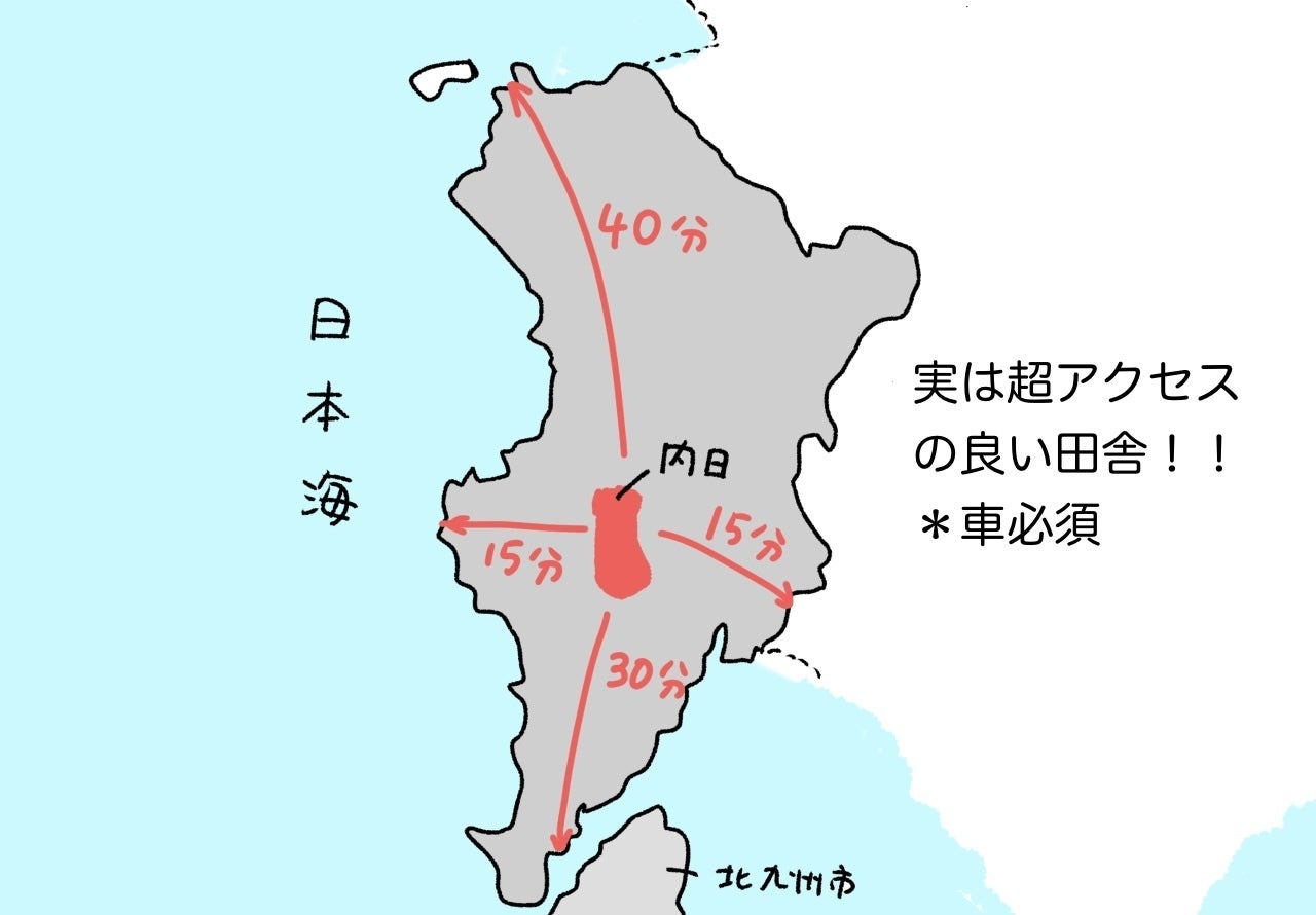 内日地区は下関の中心に位置しているため、海を挟んで福岡県の門司まで車で30分、山をこえて海岸まで15分、人気の観光地角島まで40分と、どこに行くにも便利です!