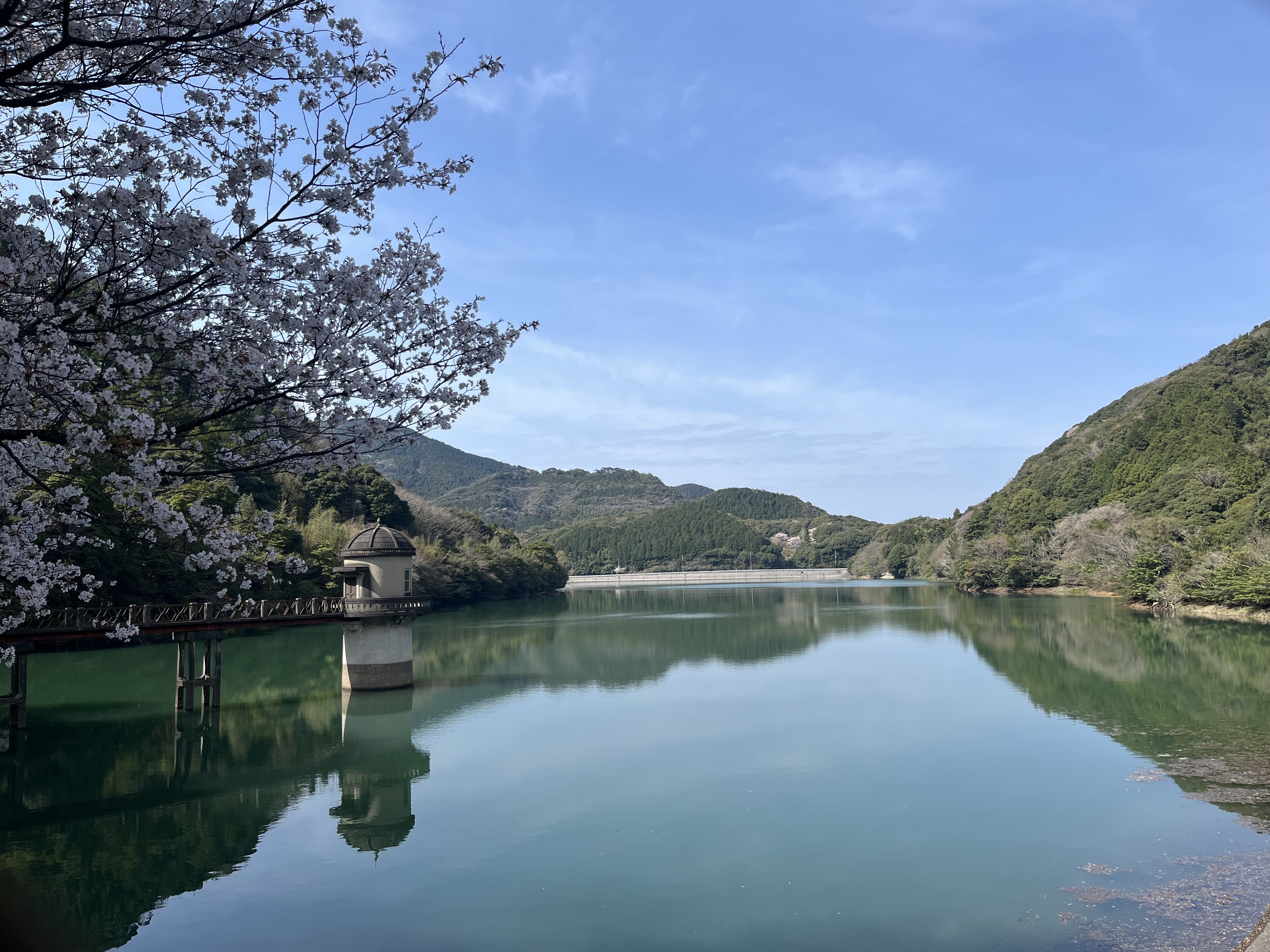 古民家のすぐ近くの内日第二貯水池。取水塔は登録有形文化財
