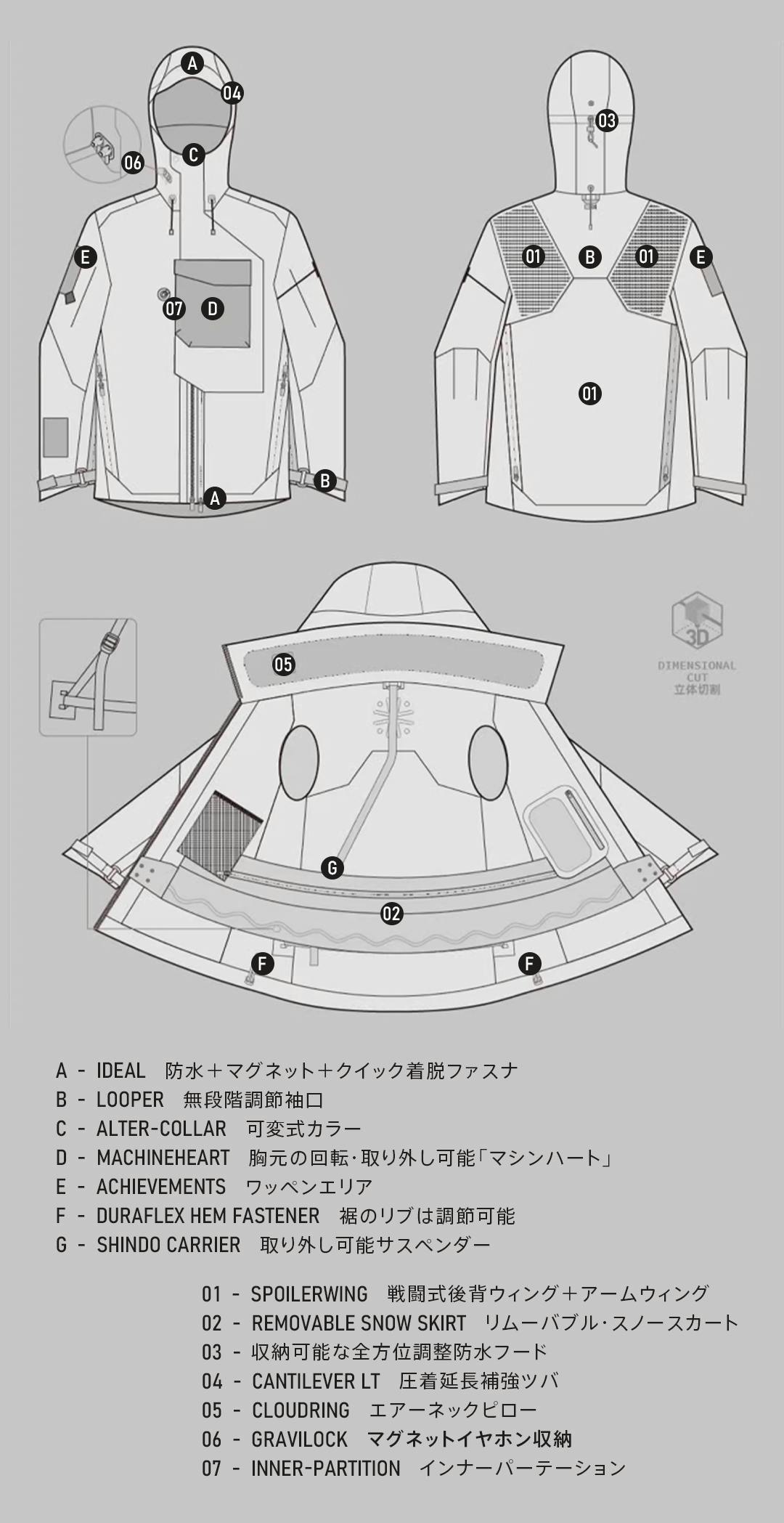 ※CORDURAは裾、袖の絞るテープ部分、取外し可能な胸ポケットの、耐久性が必要な箇所にのみ使用しています。