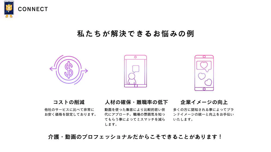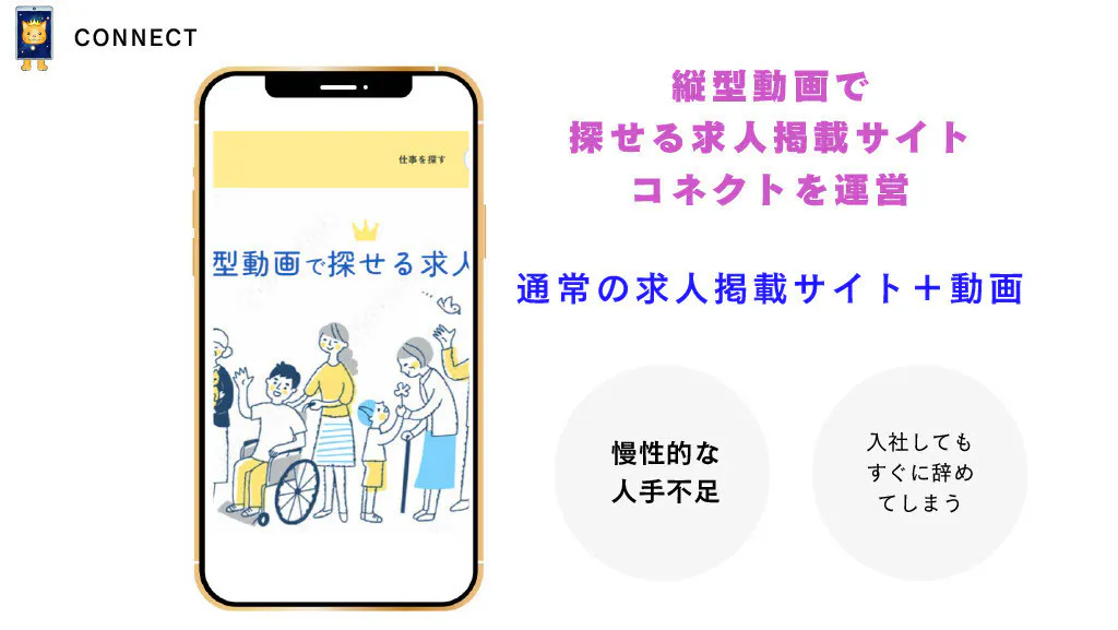 はじめまして、株式会社CONNECT代表の奥野佑樹と申します。 私は長い間ケアマネージャーとして働いてまいりました。現場で見聞きしたこと、感じたこと、そして大きすぎる諸問題の数々を実感してまいりました。 「これまでと同じことをやっていては、これからを変えることはできない」 そう感じまして、一念発起して株式会社CONNECTを立ち上げました。 ここで、介護関係に特化した求人システムを創るべく、日々努力しております。 その試行錯誤の中で、もっとも突き刺さったことが「縦型動画」です。 いま、リール動画、ショート動画、TikTokなどの視聴者と介護施設への求人をマッチングさせることで、若い方々へのアピールをすることが出来る。またそれをスタートとして、就職を考えている方からの相談、施設の方からの相談、続けられる職場にするためのご提案などができる総合した「求人サイト」を創ろうと思いました。 映像でアピールすることで、イメージだけで不安になってしまう職場への偏見をなくしていき、興味を持っていただくことに繋がります。 また募集する施設としても、イメージを覆すことで利用者さま、そのご家族へ安心していただけることが考えられます。 見やすく、分かりやすく、心配事がすべて解決し、求職者にも、応募者にも、施設の利用者にも優しく丁寧なサイトを作ります。