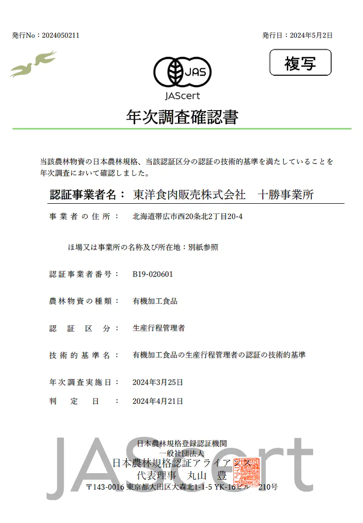 有機農産物と違い、農場から食卓に届くまでの間に関わる機関、牛肉の場合は、と場、加工業者など辿るルートの事業者すべてがJAS有機の認証を受けています。