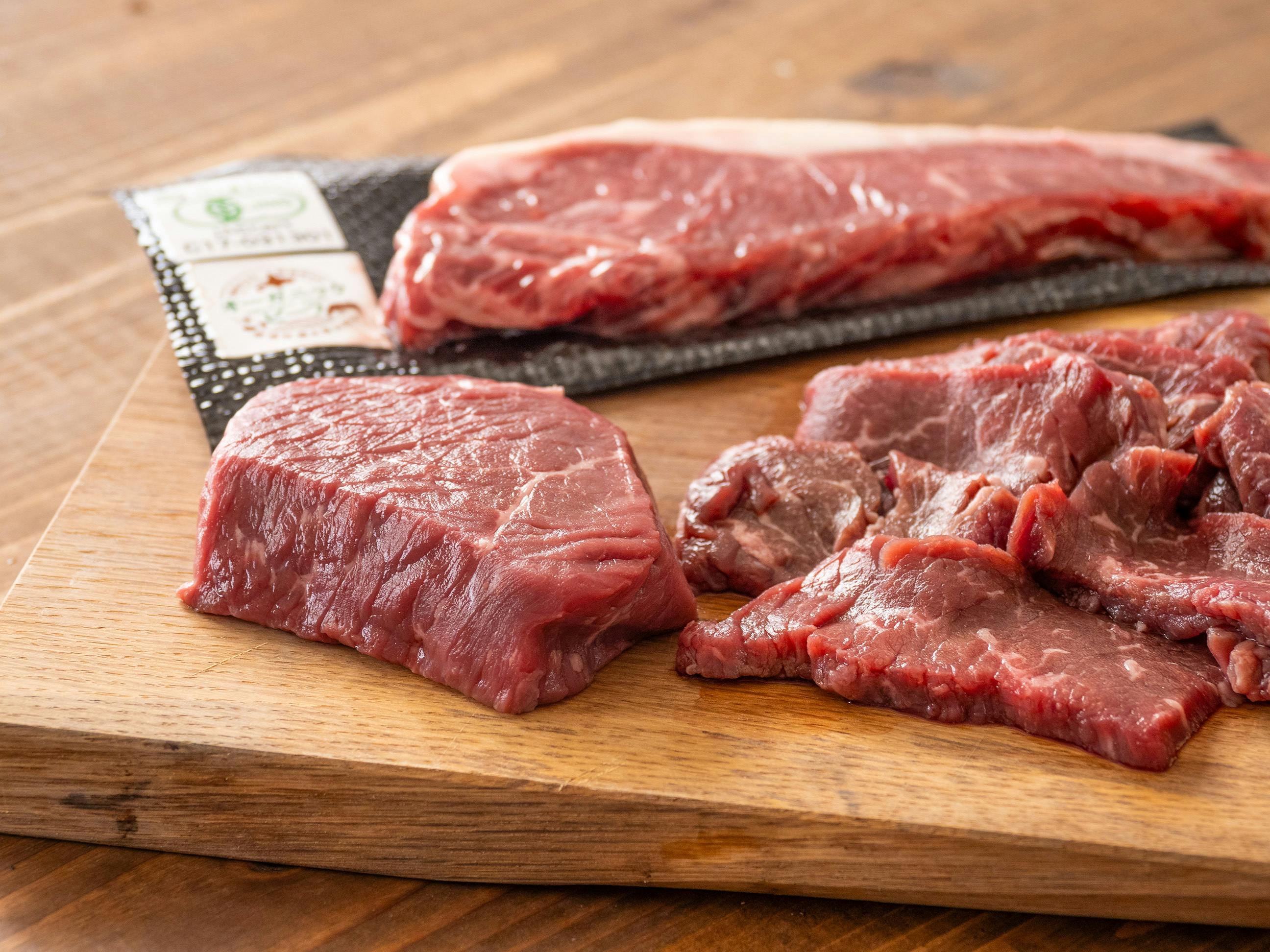 その肉質は赤身がとても多く脂肪が黄色いのも特徴です。良質な草を求めて放牧地を運動するので、しっかりめの歯ごたえと自然を凝縮したような肉本来の旨味が魅力です。