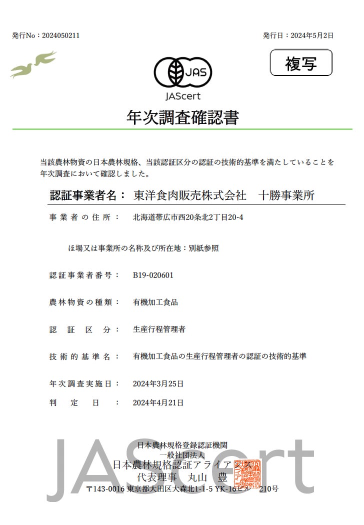 有機農産物と違い、農場から食卓に届くまでの間に関わる機関、牛肉の場合は、と場、加工業者など辿るルートの事業者すべてがJAS有機の認証を受けています。