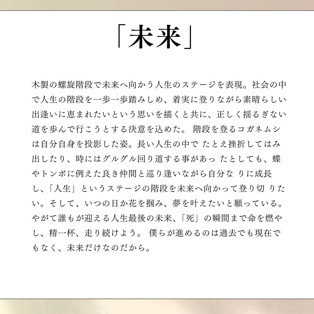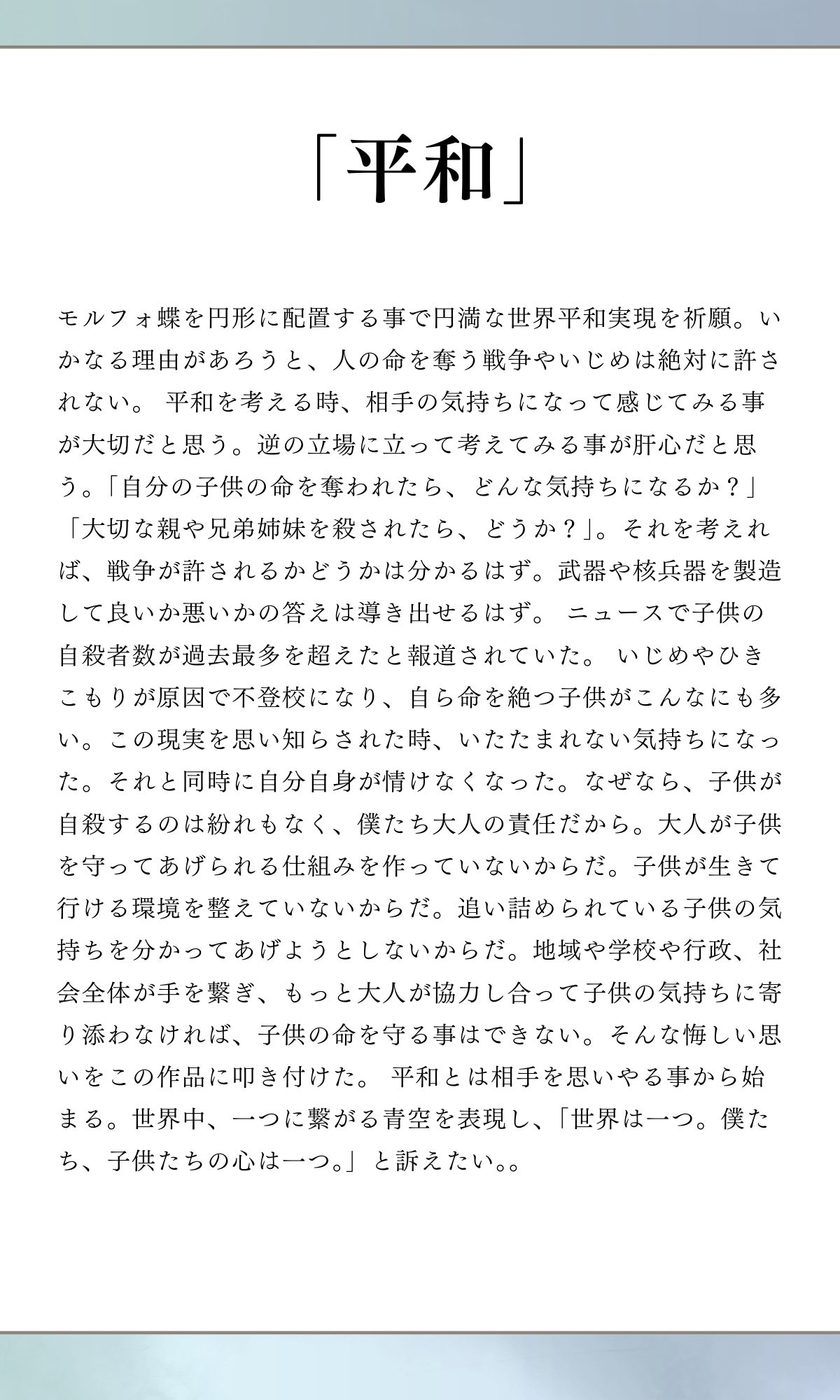 蝶たちが生きるために工夫して編み出した進化の美を最大限表現すべく、自分の原点に立ち返り、目指していた芸術作品を創作しようと心に決めました。