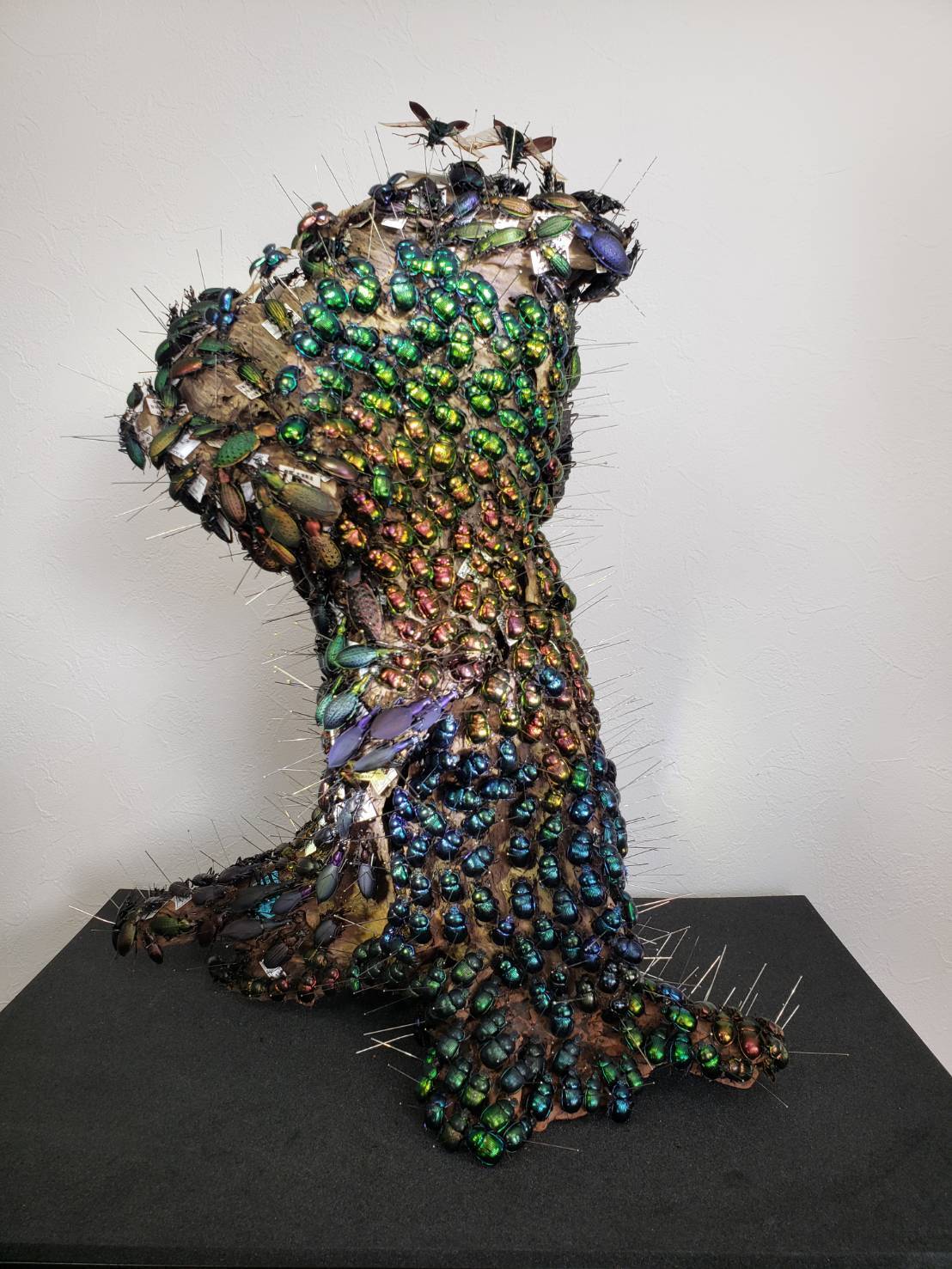 カナブンは固い羽根を閉じたまま下の薄い羽根だけ広げて飛ぶ姿を再現。自身の生きたかを投影するように
