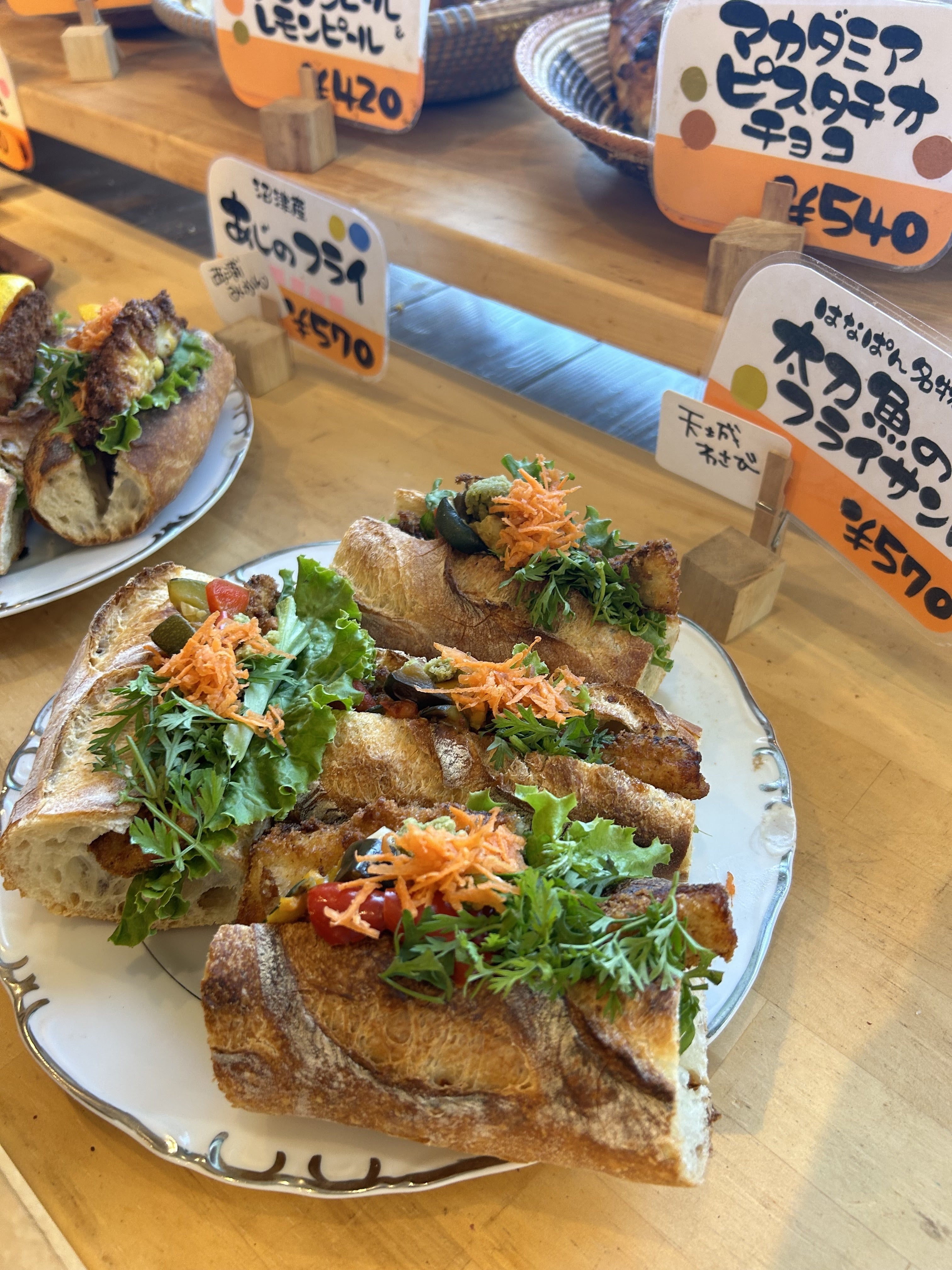 漁に出ると、市場には卸せない魚も獲れることがあります。小さかったり、傷がついたり、様々な理由がありますが、海の資源を捨ててしまうことに抵抗がありました。そこで未利用魚を「はなぱん」で買い取り、魚のフライをはさんだバゲットサンドを販売し始めました。自分で釣った魚を使い、今では「太刀魚フライサンド」はお店の一番人気を誇るメニューです。