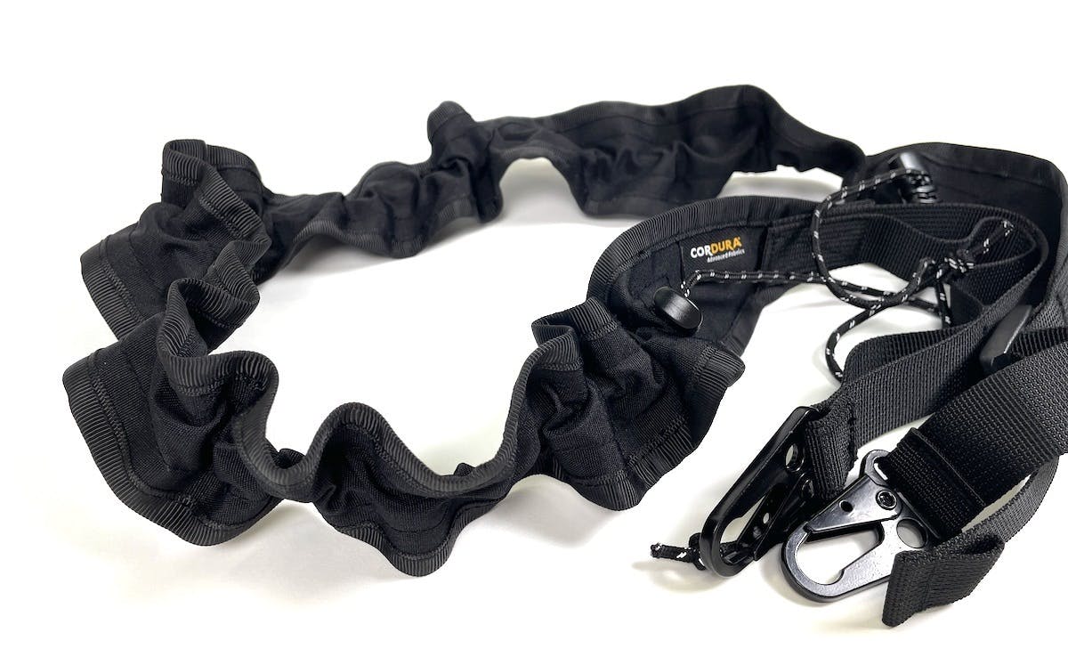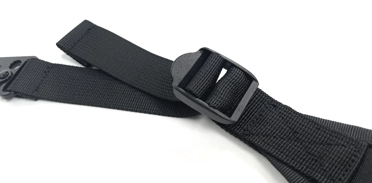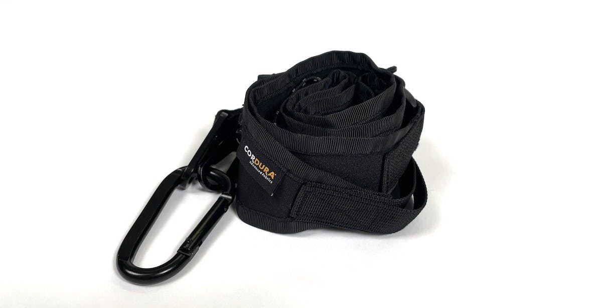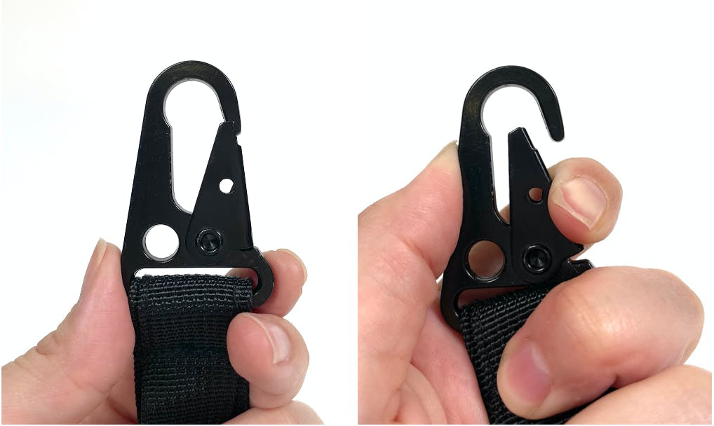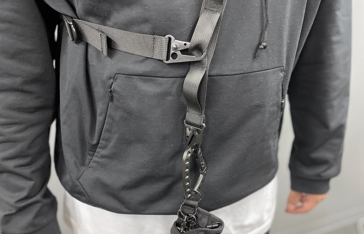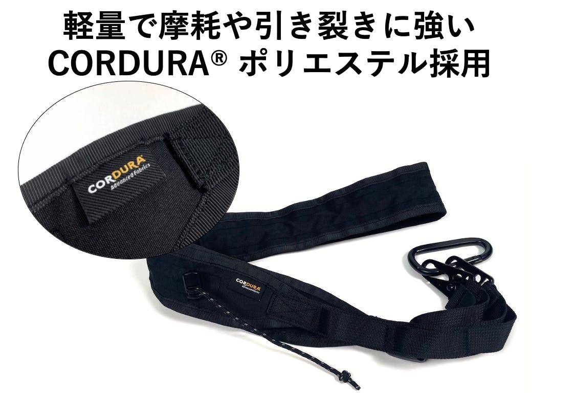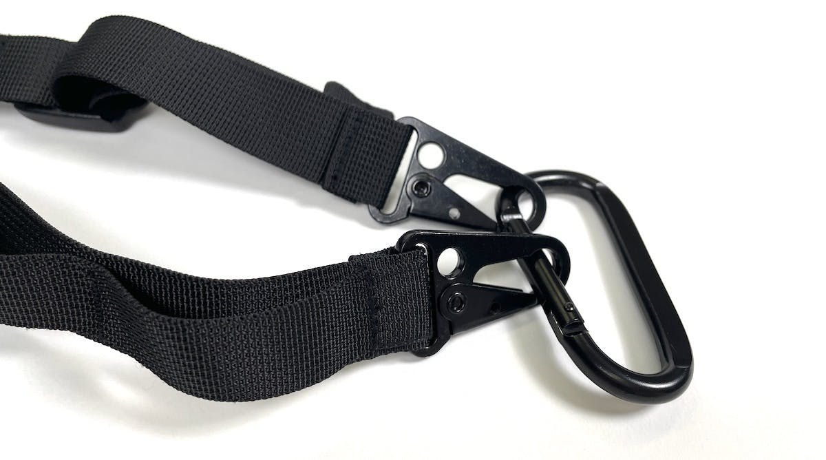 ウェビングループにカニカンを引っ掛けて、ショルダーハーネスのように使うのも便利。