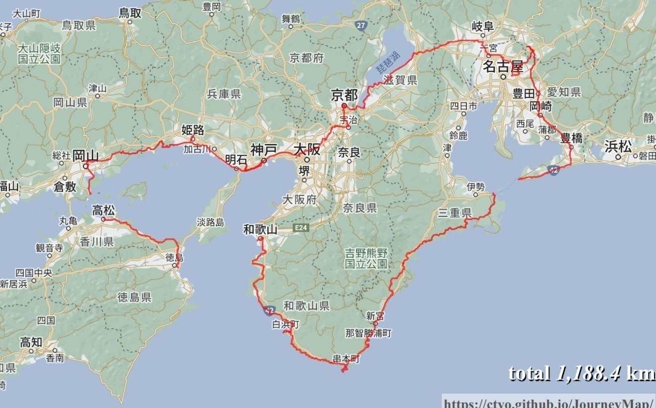 この春には紀伊半島を鳥羽から和歌山市までぐるっと周り、太平洋岸の美しい景色を楽しみました。道中機材トラブルで走れなかった串本〜白浜の南紀白浜は、その翌日に自転車で引き返し、しっかりと走り切ることができました。