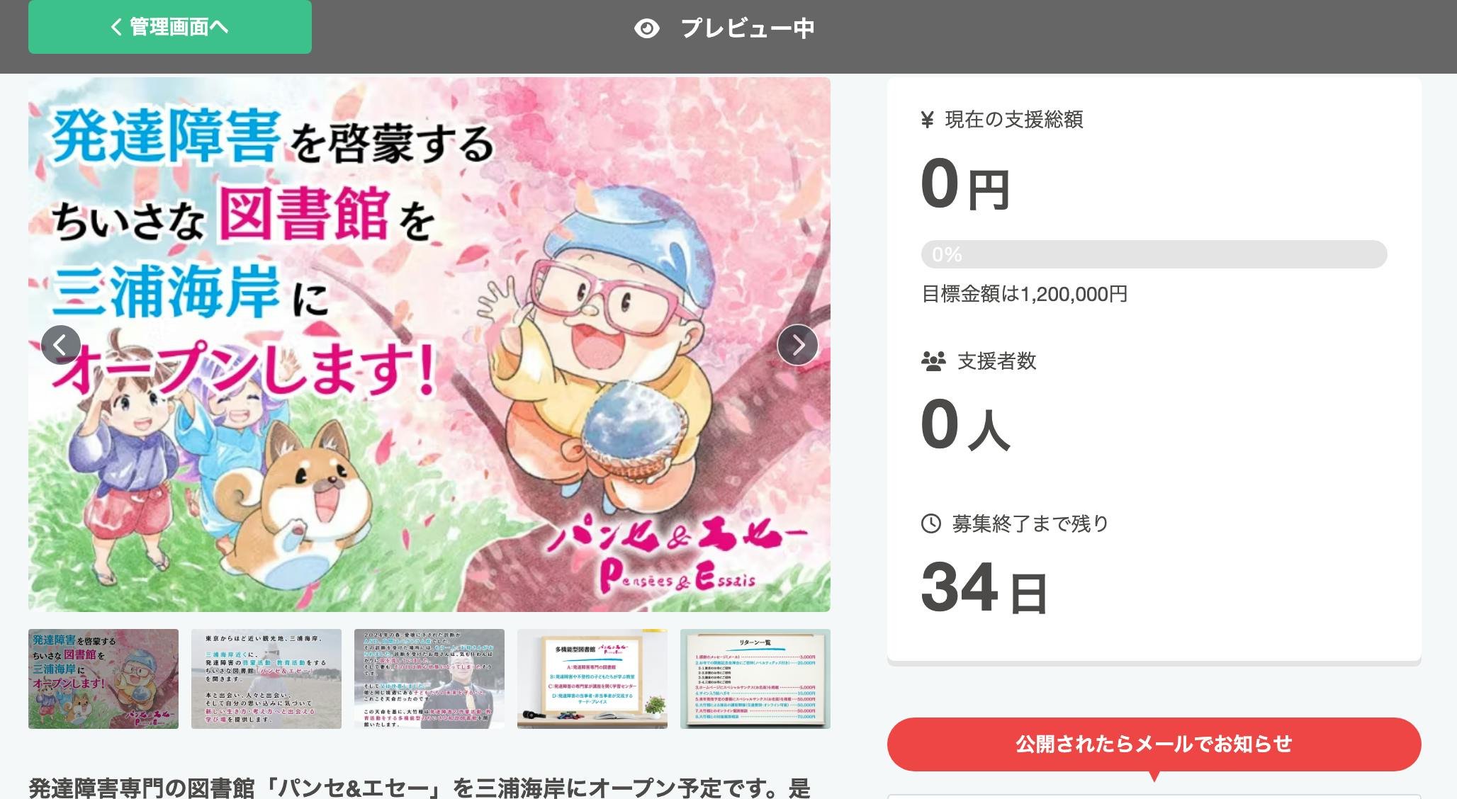 2025/10/01 18:00いつもお世話になっております。本日、私「大竹稽」の想いを込めた特別なプロジェクトがスタートいたしました。【発達障害専門多機能型図書館】「パンセ&エセー」を三浦海岸にオープンしたい!※写真はイメージです【なぜ、今この図書館が必要なのか?】2024年春、愛娘がASD(自閉スペクトラム症)と診断されました。 その診断の場で出会ったお母さんが、気も狂わんばかりに涙を流している姿を見て、私は決意しました。「娘と同じ境遇にある子どもたちの未来を守ること。これこそ天命だ」発達障害の子どもやご家族は、ともするとグループから外れ、孤立してしまいがちです。「一般とは違う」という重いのしかかる現実。そんな時だからこそ、本と出会い、人々と出会い、新しい生き方・考え方と出会える「学び場」が必要なのです。【「パンセ&エセー」が提供する4つの価値】 A:発達障害専門の図書館厳選された書籍を無料で貸し出し。発達障害に関する専門書から、心を豊かにする良書まで。 B:発達障害や不登校の子どもたちが学ぶ教室「アート」「工作」「作文」「サイエンス」「レゴブロック」など、子どもたちの個性を活かしたプログラム。 C:発達障害の専門家が講座を開く学習センター心身の成長相談、進路の悩み相談。ご家族の思い込みに気づき、子育てに活かせるセミナーを開催。 D:発達障害の当事者・非当事者が交流するサード・プレイス三浦海岸の美しい自然に囲まれた、何もしない贅沢な時間を過ごせる場所。【場所は三浦海岸 - 特別な理由があります】東京からほど近い観光地、三浦海岸。ウィンドサーフィンワールドカップも開催される美しい海岸近くに、この小さな図書館を開きます。白い砂浜、映画やドラマのロケ地としても使われるこの場所で、子どもたちと家族が**「自由」と「豊かさ」**に満ちた時間を過ごせるのです。【大竹稽の実績と信頼】これまで23冊の著書・編著を出版し、教育活動にも力を入れてきました。「令和の虎」出演こども禅大学クラウドファンディング達成の実績代表作『超訳モンテーニュ』『ツッコミ!日本むかし話』など【最後に - 時間は待ってくれません】発達「障害」は才能です。障害があろうがなかろうが、すべての子どもは対等の存在です。しかし、子どもにとっての1年は、大人の1年とまるで違います。大人たちが行動しないまま過ごした1年で、子どもたちは次の学年に進んでしまいます。子どもたちの1分1秒を無為にすることはできません。【今すぐご支援を】プロジェクト詳細・ご支援はこちら:https://camp-fire.jp/projects/876917/viewこのような偏見と戦い、子どもたちの健やかで自由な未来を創る仲間となっていただけませんか?皆様の温かいご支援を、心よりお待ちしております! もっと見る
