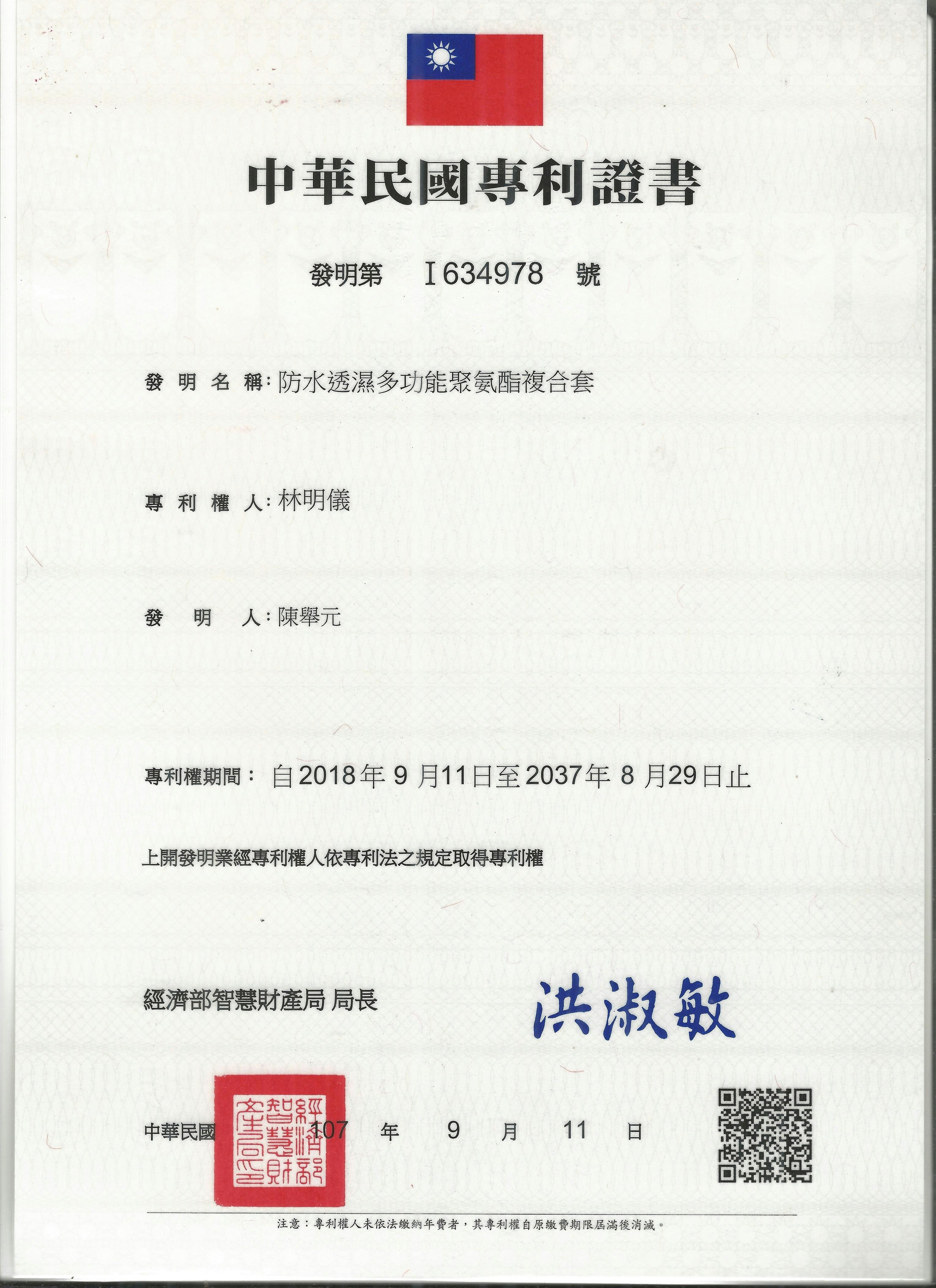 そして遂に2018年水漏れの原因となる「縫い目」の無い一体型の防水シューズカバーの開発に成功したのです。この新開発は同時に【台湾国家発明特許】第1634978号も取得したのです。