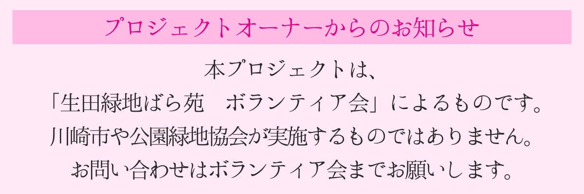 バラの魅力、ばら苑の楽しみ方、課題などを伝え、多くの人と共有し、ばら苑を今まで以上に楽しんでもらえるようにしたいです。生田緑地は「全国都市緑化かわさきフェア(緑化フェア)」のコア会場でもあります。ばら苑の企画として「ばら苑特別展示(秋)」が計画されています。この時期に、記念誌とトークショーで更にばら苑や緑化フェアを楽しめるものにしたいと計画しています。