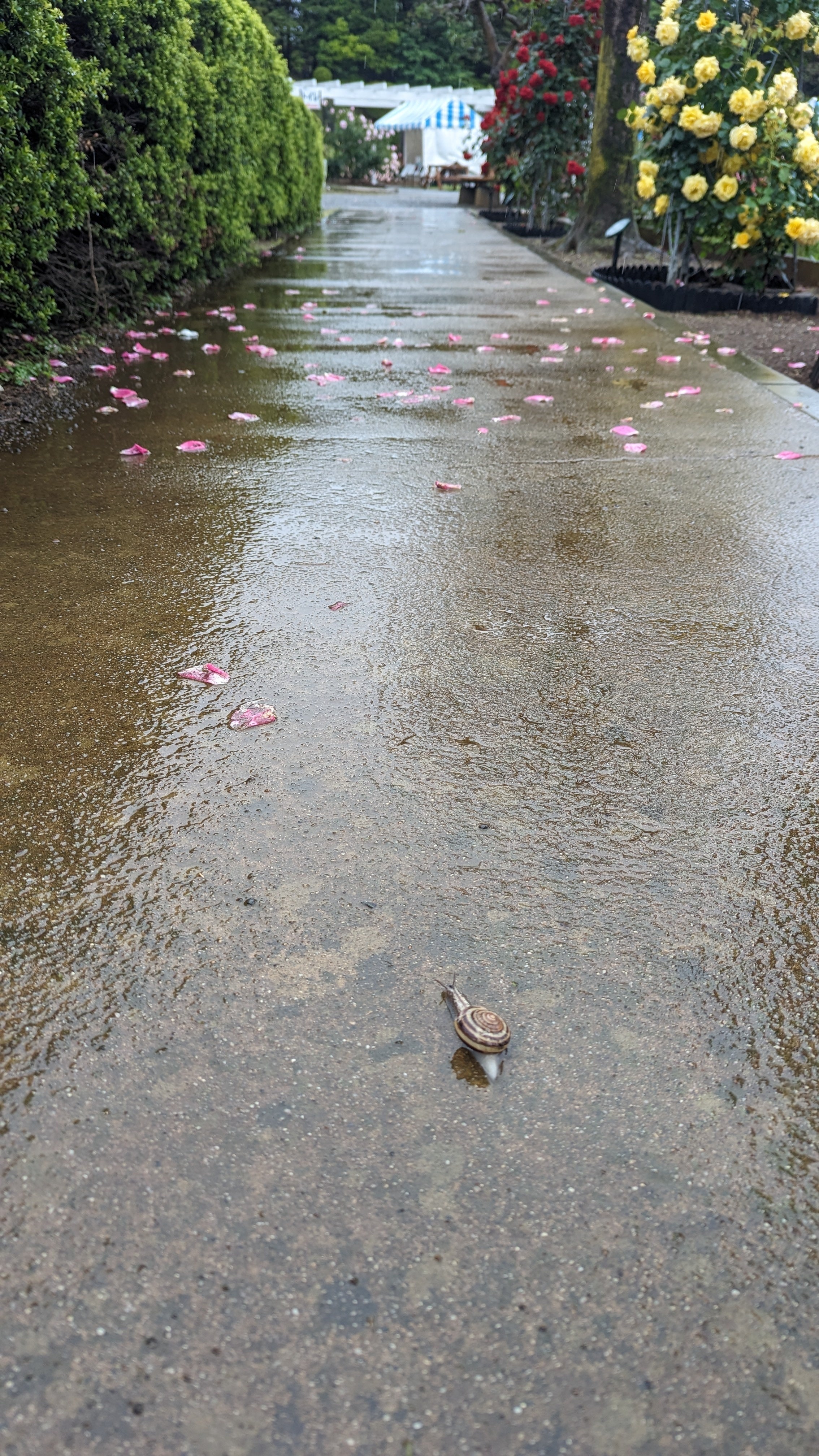 今朝は雨に打たれて傷んだバラの花枝が少し目立ちますが、ボランティアさんも早く来たりしてお手入れをしてます。