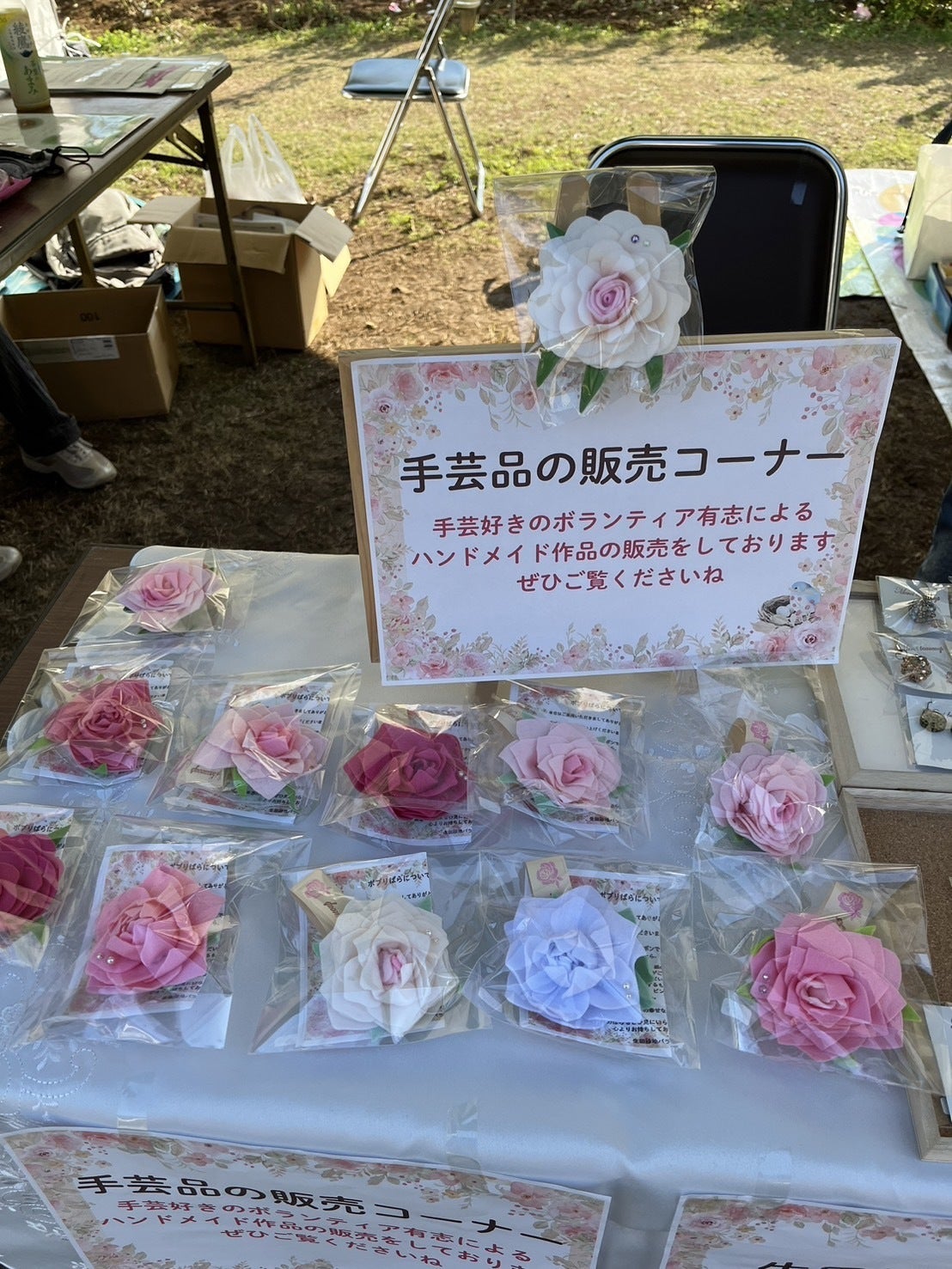 テントブースではクラウドファンディングの体験リターン品としても活躍した「ポプリ入りフェルトのバラ」などの手芸小物の販売も行うことができました。