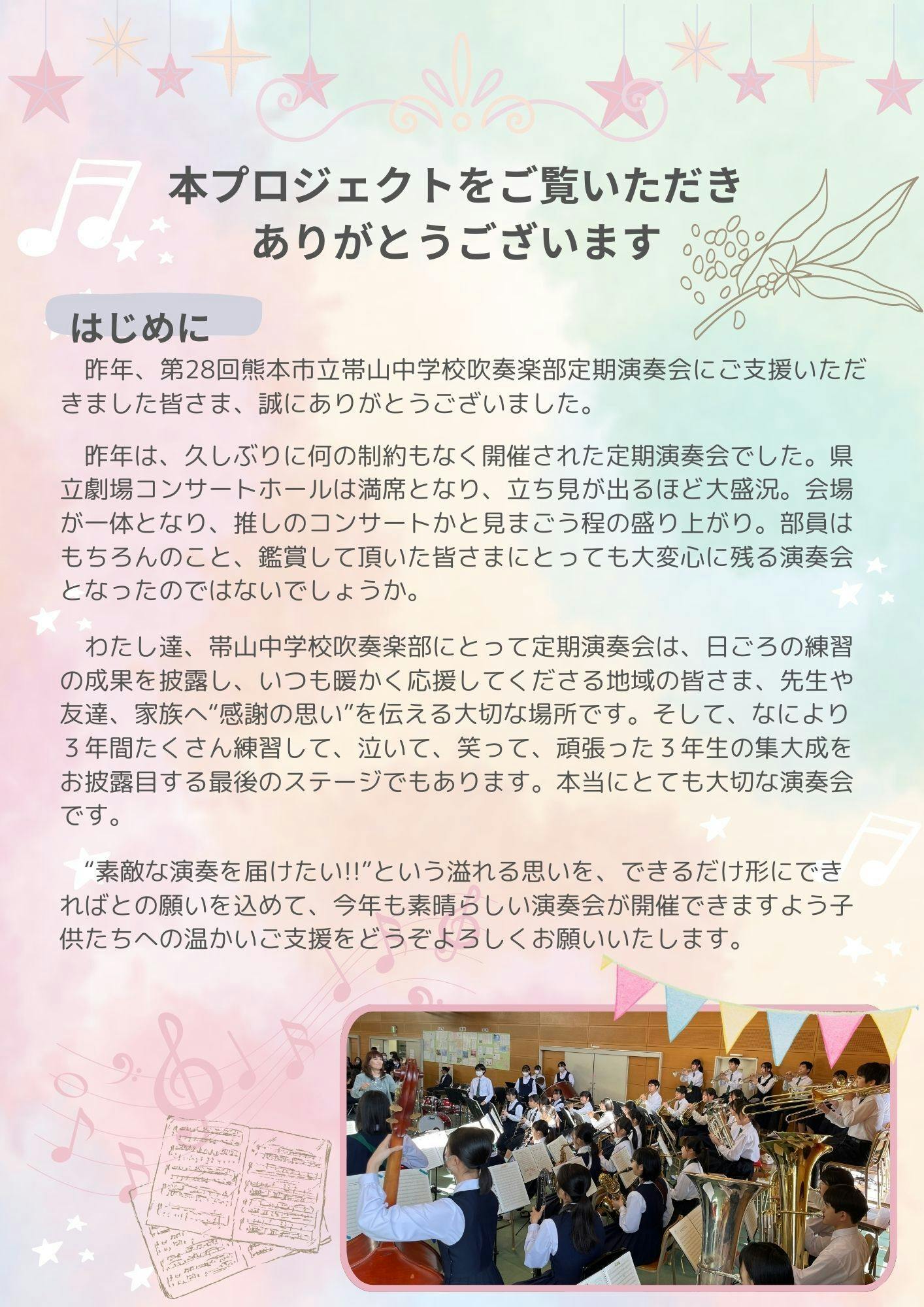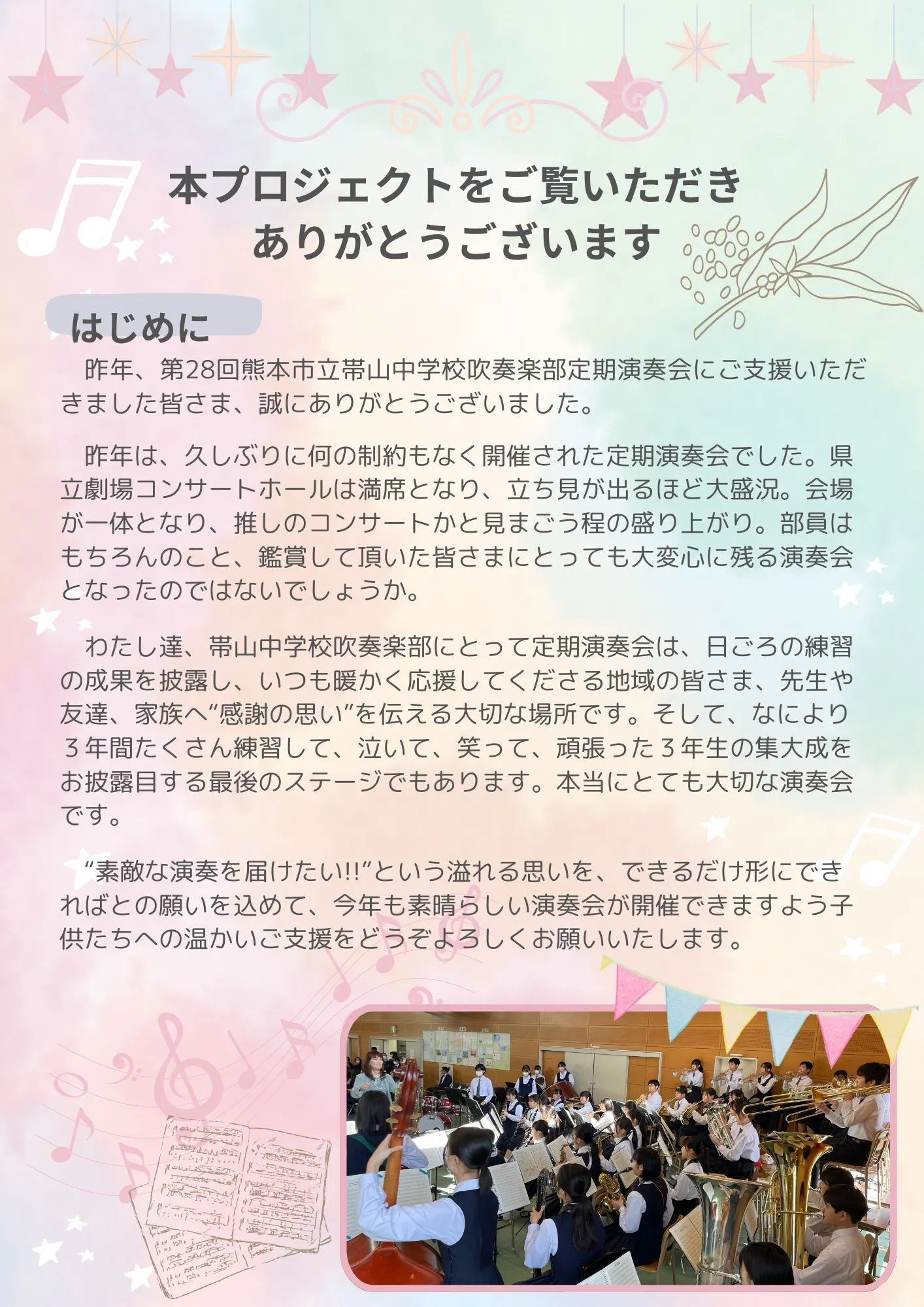 このプロジェクトが成功することで、全国の吹奏楽部の希望となり、学生達の輝く未来へつながって行くことを願っています。たくさんのご支援をお待ちしています。