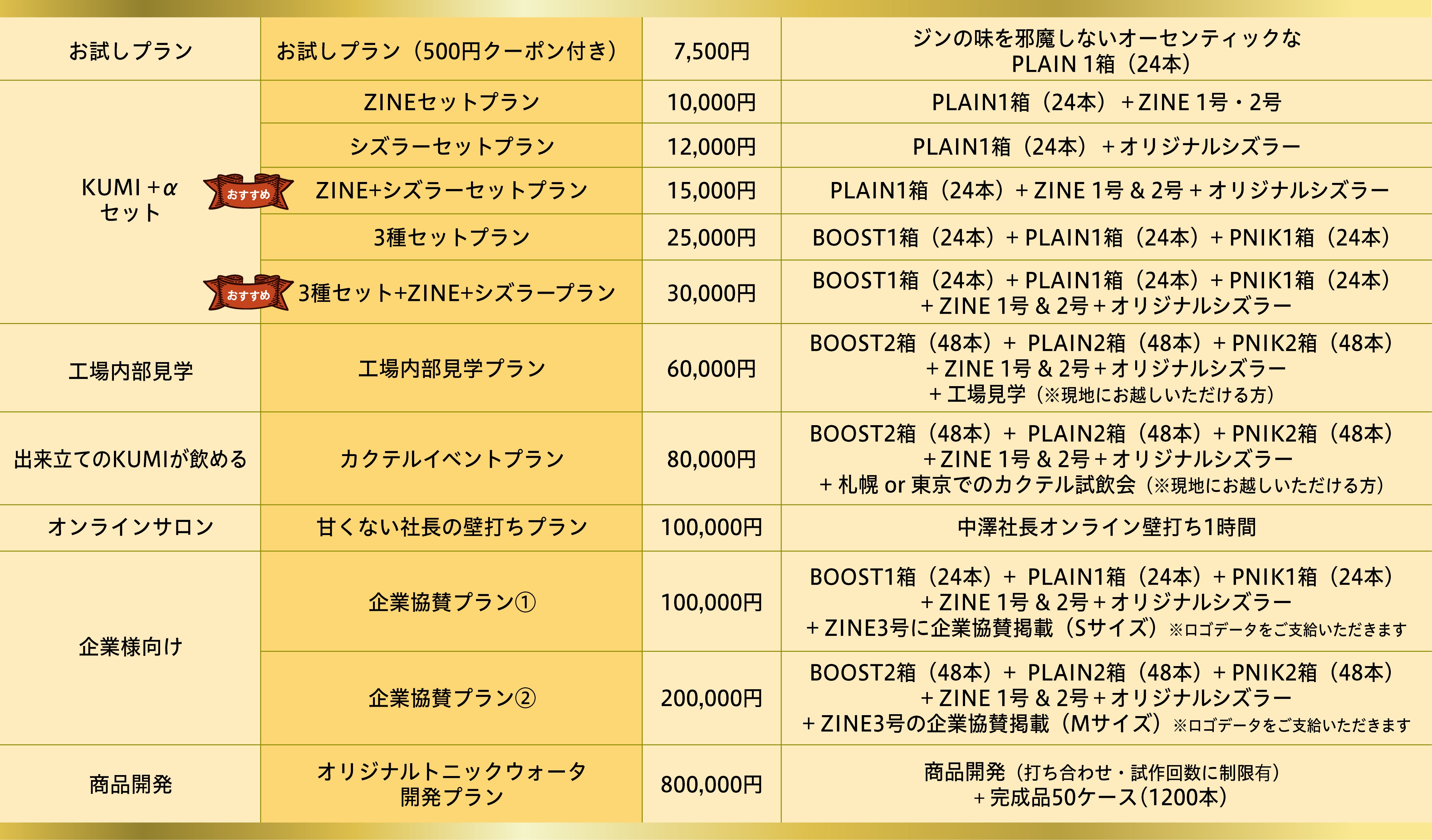 2024/08/27 14:47応援頂きました皆様へクラウドファンディングではトニックウォーター【KUMI】をご支援頂きまして誠にありがとうございました。7月に商品を発送してから、様々な方より嬉しいお声をいっぱい頂きました。おかげさまでとてもいい船出となりました!「そのまま飲んでも美味しい!」というありがたいお言葉も頂戴しました。トニックウォーターをそもそも飲まなかった方にも「美味しい」と言ってもらえる。そんな夢が叶ったのは、私にとって大きな一歩になったと思います。ご報告が遅れましたが、この度8月9日にリキュール製造の免許を取得いたしました。これでジントニックを開発するなど、さらなる商品作りができそうです。新商品の発売も楽しみにしていてください。そして、応援メッセージをくださったジェーニャさんも、先日【BITTER POPS COMPANY】の工場にお越しくださいました。その様子がYouTubeにアップされておりますので、工場見学のつもりでご覧いただけたらと思います。【GinYa】”苦みへのコダワリ”トニックウォーターBITTER POPS COMPANY工場見学【ジンヤ】https://youtu.be/DKKmk5tXwqg?si=849lHhwzAZlQLFwuなお、商品発送のリターンは完了いたしましたが、工場見学や壁打ちなどのリターンをお待たせしております。現在、缶の製造設備を整えており、完了した時点でご案内を差し上げるつもりです。それでは、引き続き【BITTER POPS COMPANY】とトニックウォーター【KUMI】を一緒に広めて頂けると幸いです!よろしくお願いいたします! もっと見る本日リターン商品のKUMIを発送いたします!