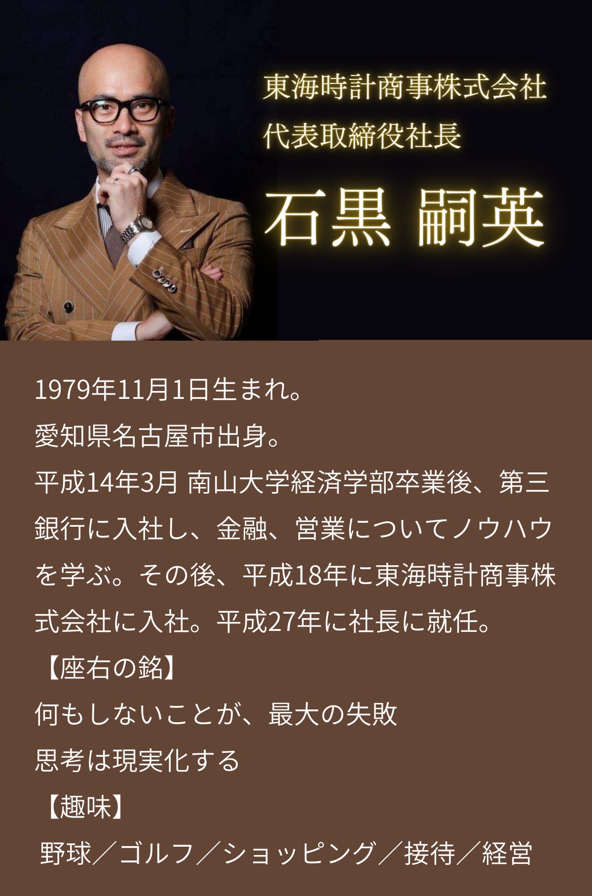 はじめまして!東海時計商事株式会社 代表取締役社長の石黒嗣英(いしぐろつぐひで)と申します。