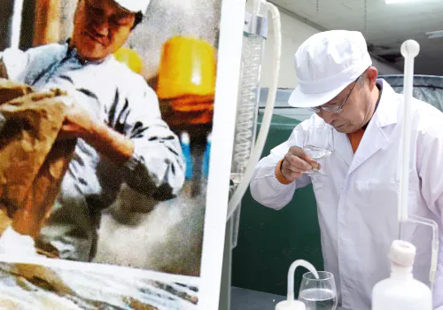 日本酒造りで培った技術を最大限に活かし、日本酒造りの繊細さと、焼酎造りの大胆さ、この両方の技術を用い日々丹精こめて製造しております。もっとも、杜氏は『この焼酎の味わいは京都(亀岡)の自然が育んだ、原料の芋が持つ素材の良さが生み出したものです』と技術以上に素材の良さを強調しています。