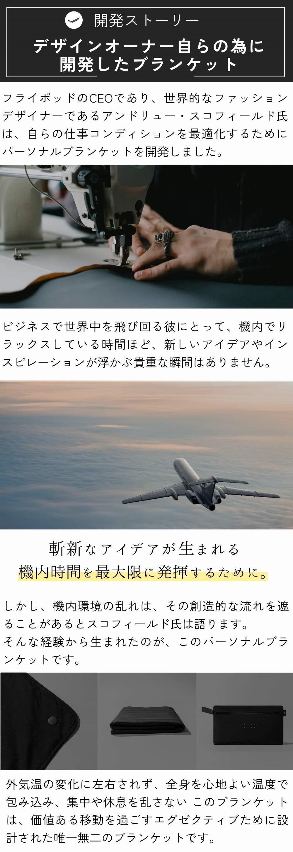 そうした背景から生まれたのが、このパーソナルブランケットです。エグゼクティブたちの貴重な時間をさらに有意義で創造的なものに変えることを目的として開発されました。このブランケットを、創造性を最大限に引き出すためのコンディションギアとしてご活用いただければ幸いです。