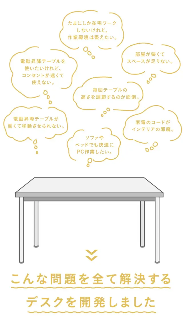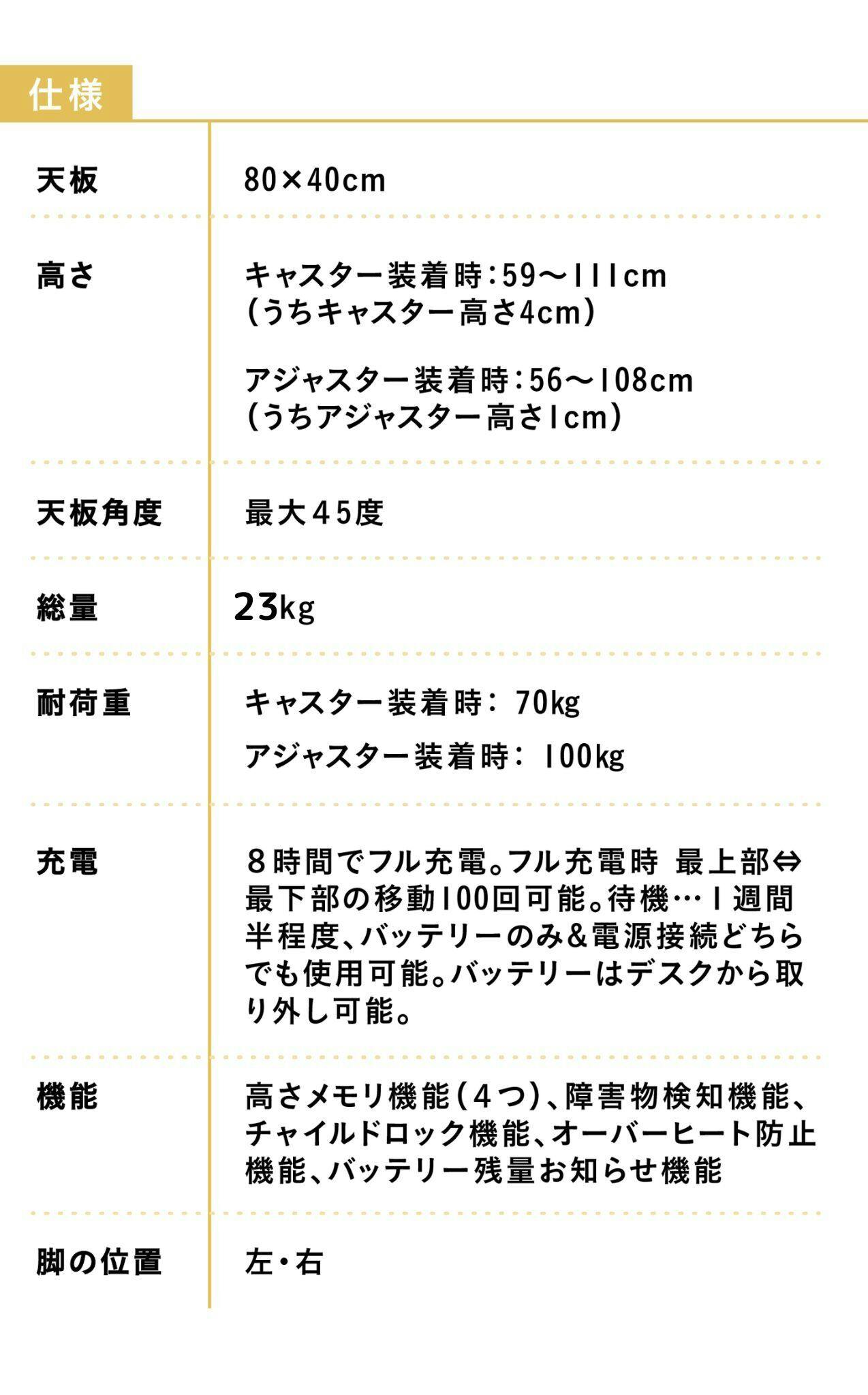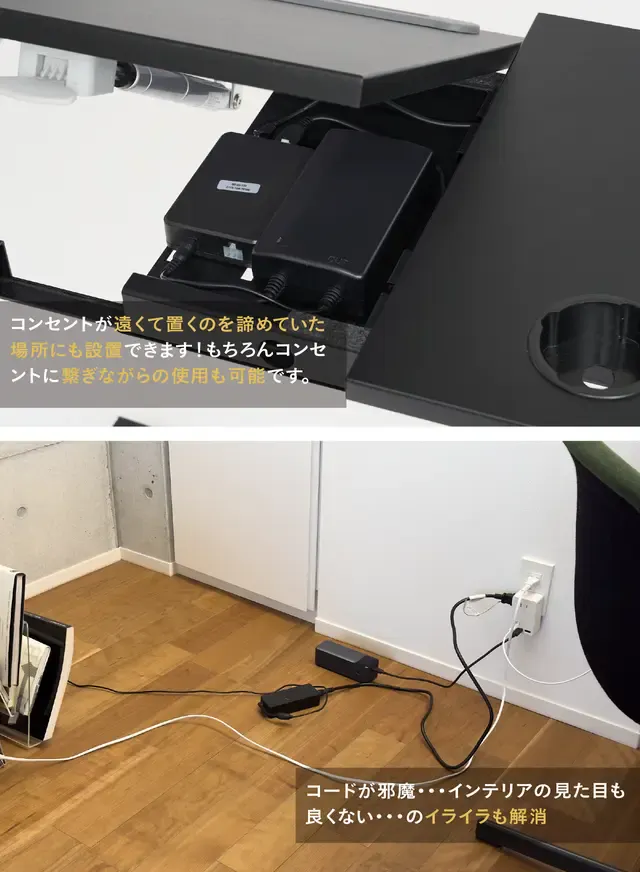 ・バッテリー式なのでコンセントが無い場所にも設置可能。電動昇降デスクの弱点を克服!