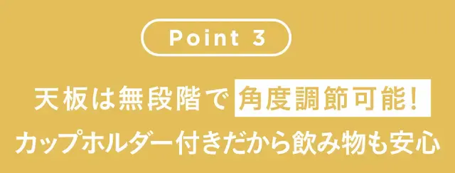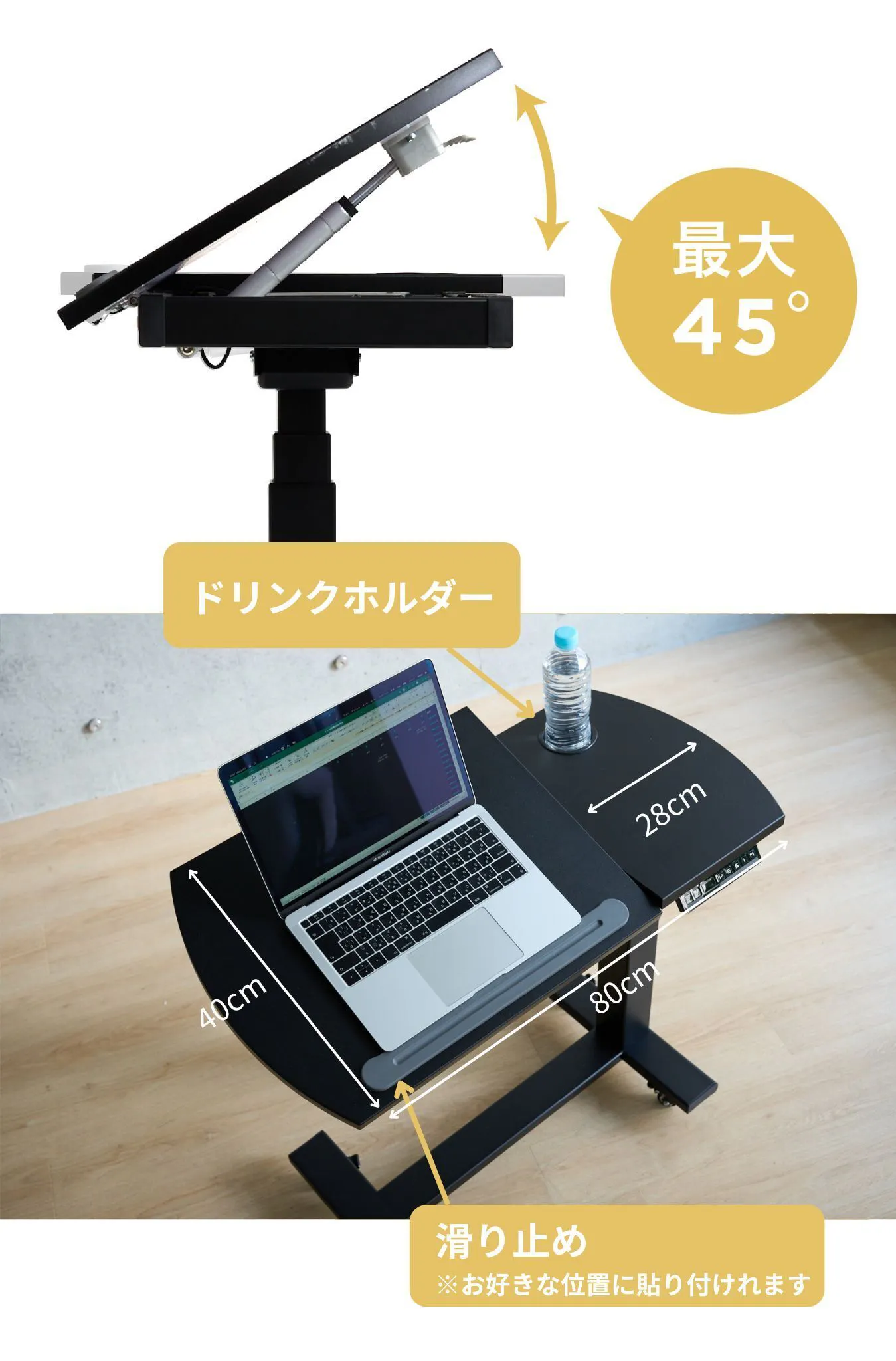 ・天板は45度まで無段階で角度調節可能。滑り止め付きだからパソコンや資料もずり落ちない。