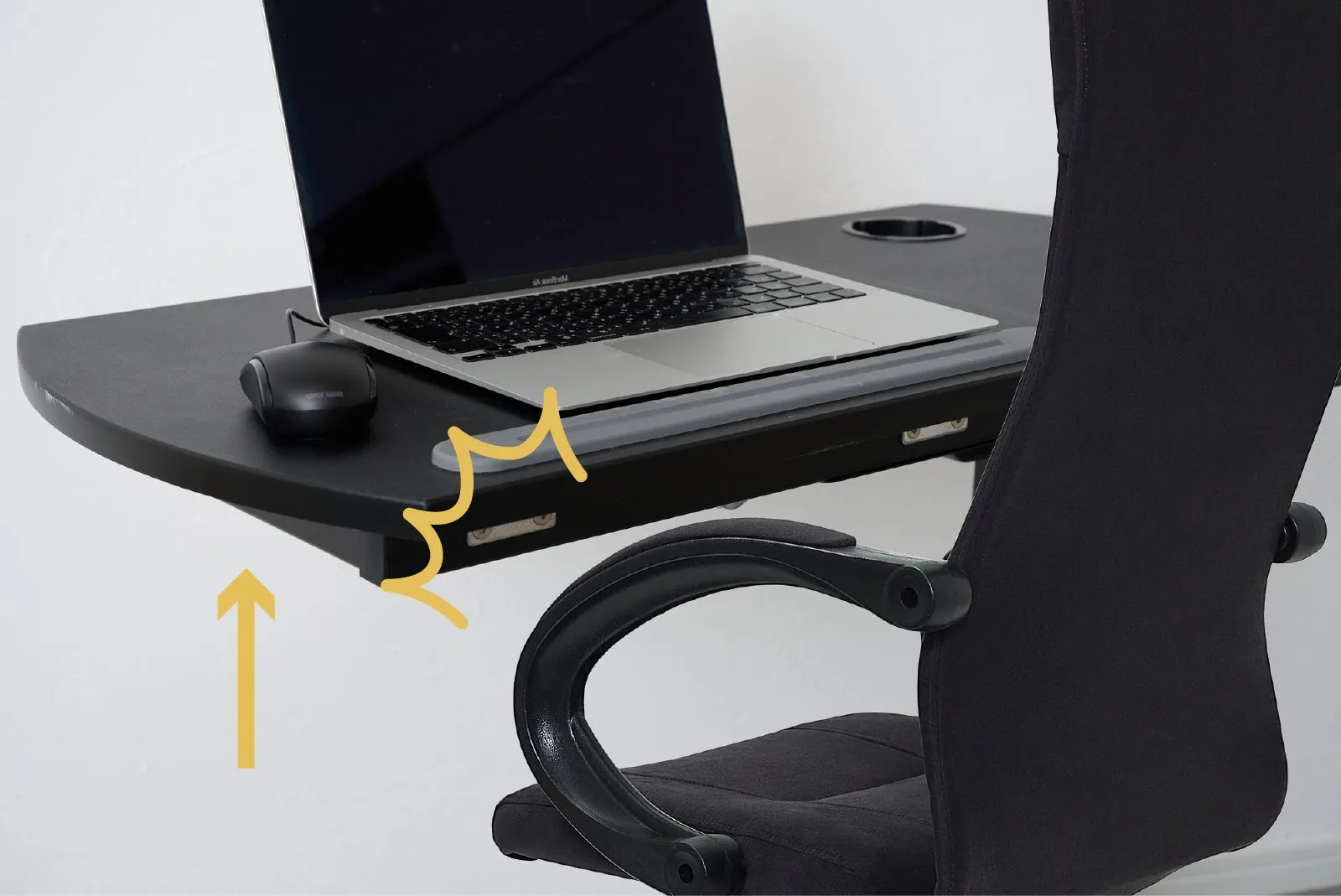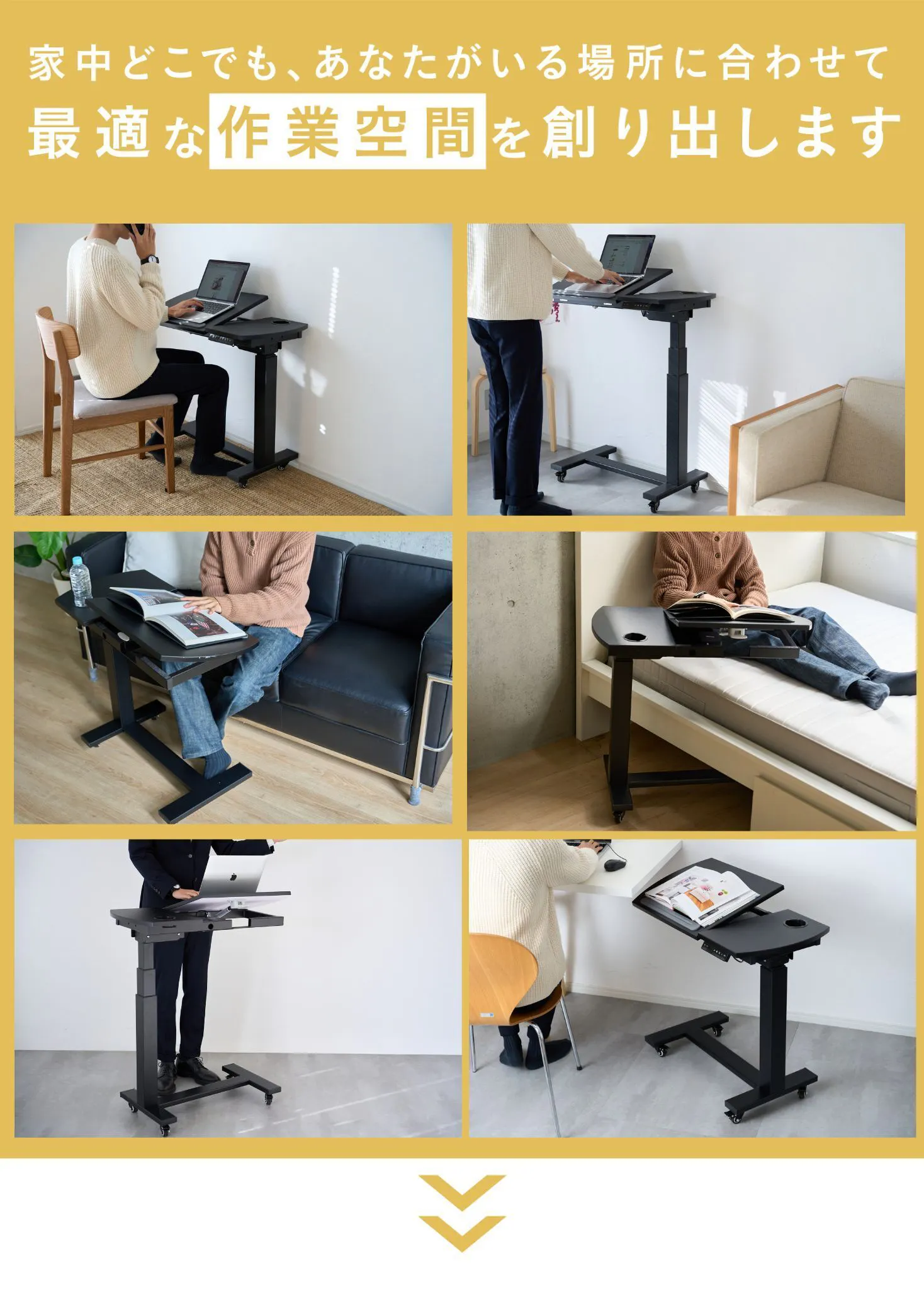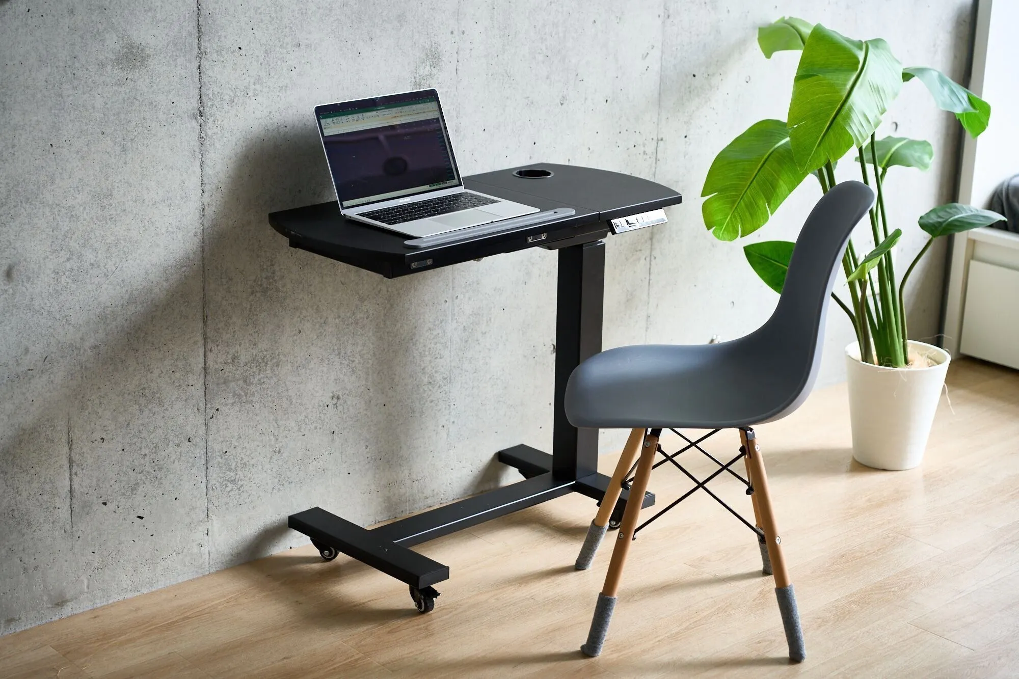自分の一番快適な姿勢に高さを合わせられ、有線も無線も使える電動昇降サイドデスクの誕生です!